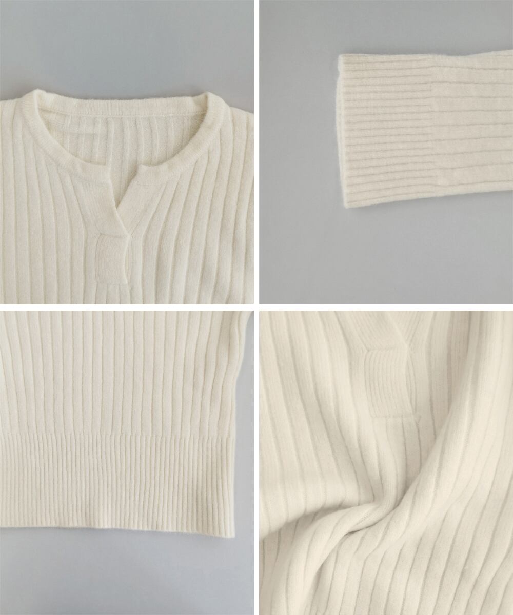 すっきり見えるリブ編みデザインの長袖ニットトップス。