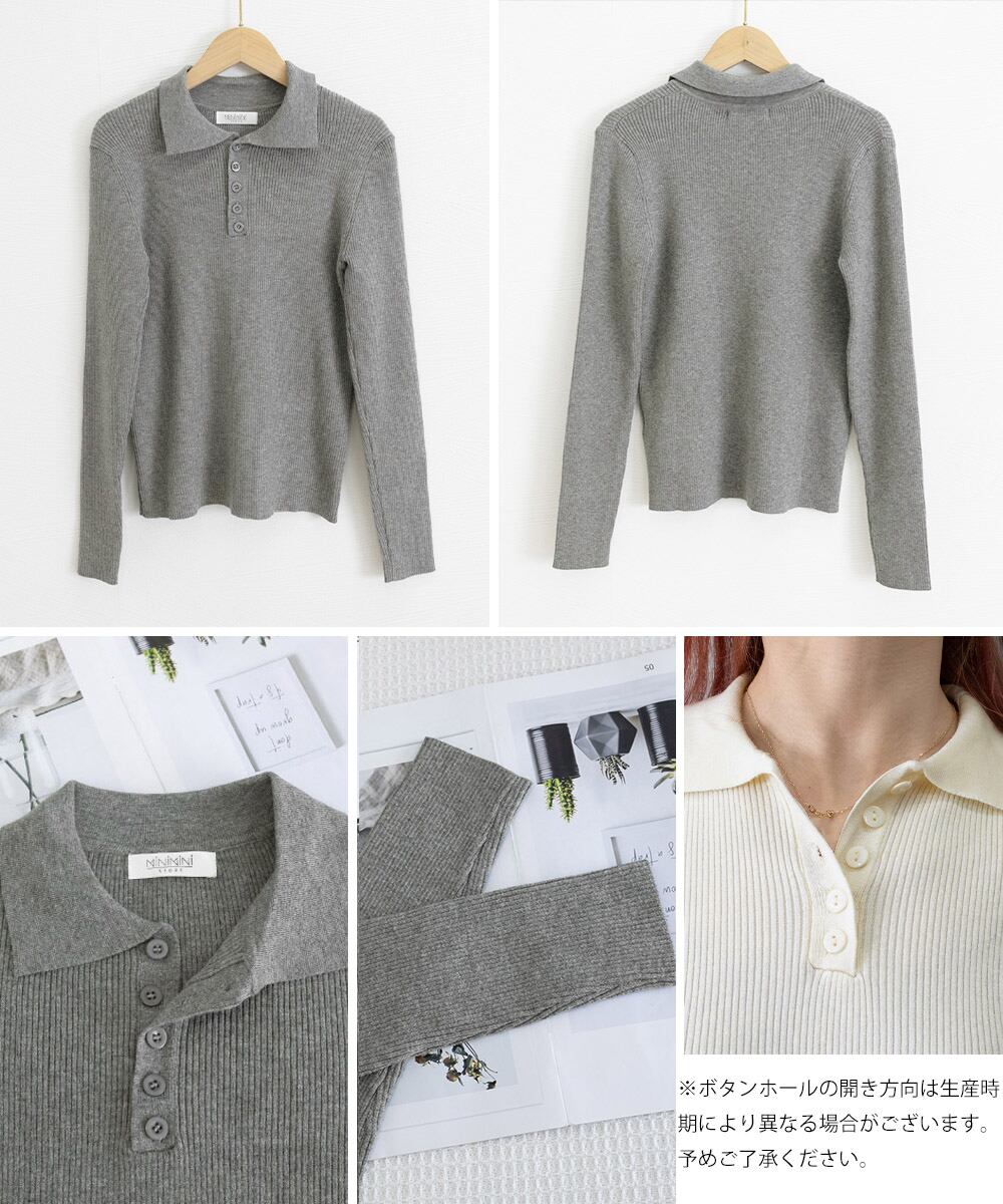 シンプルながらも洗練された印象を与えるポロリブニットトップス。