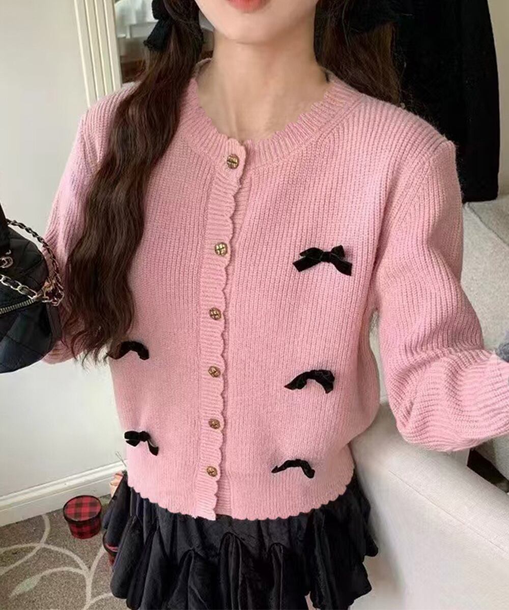 リボンモチーフが可愛いニットカーディガン。