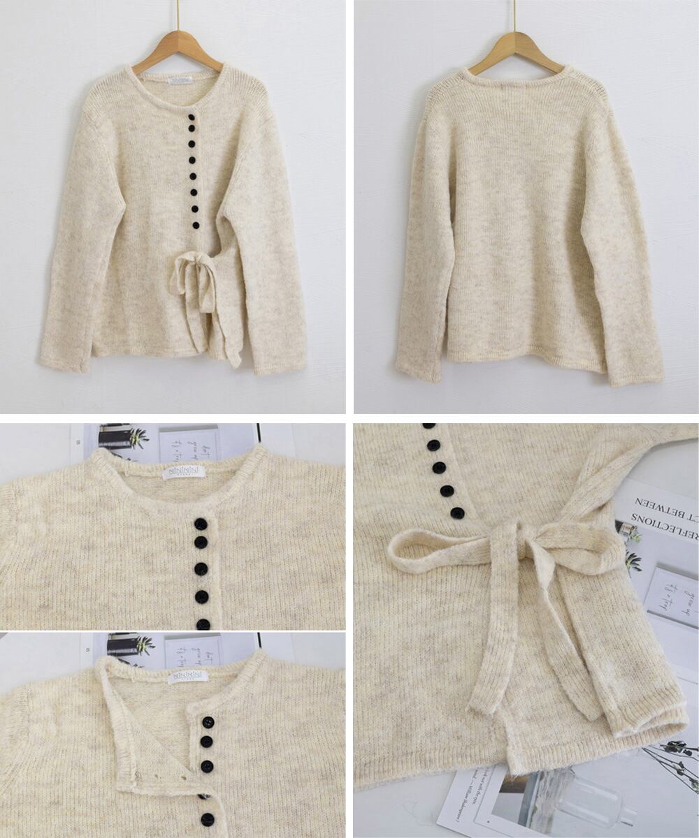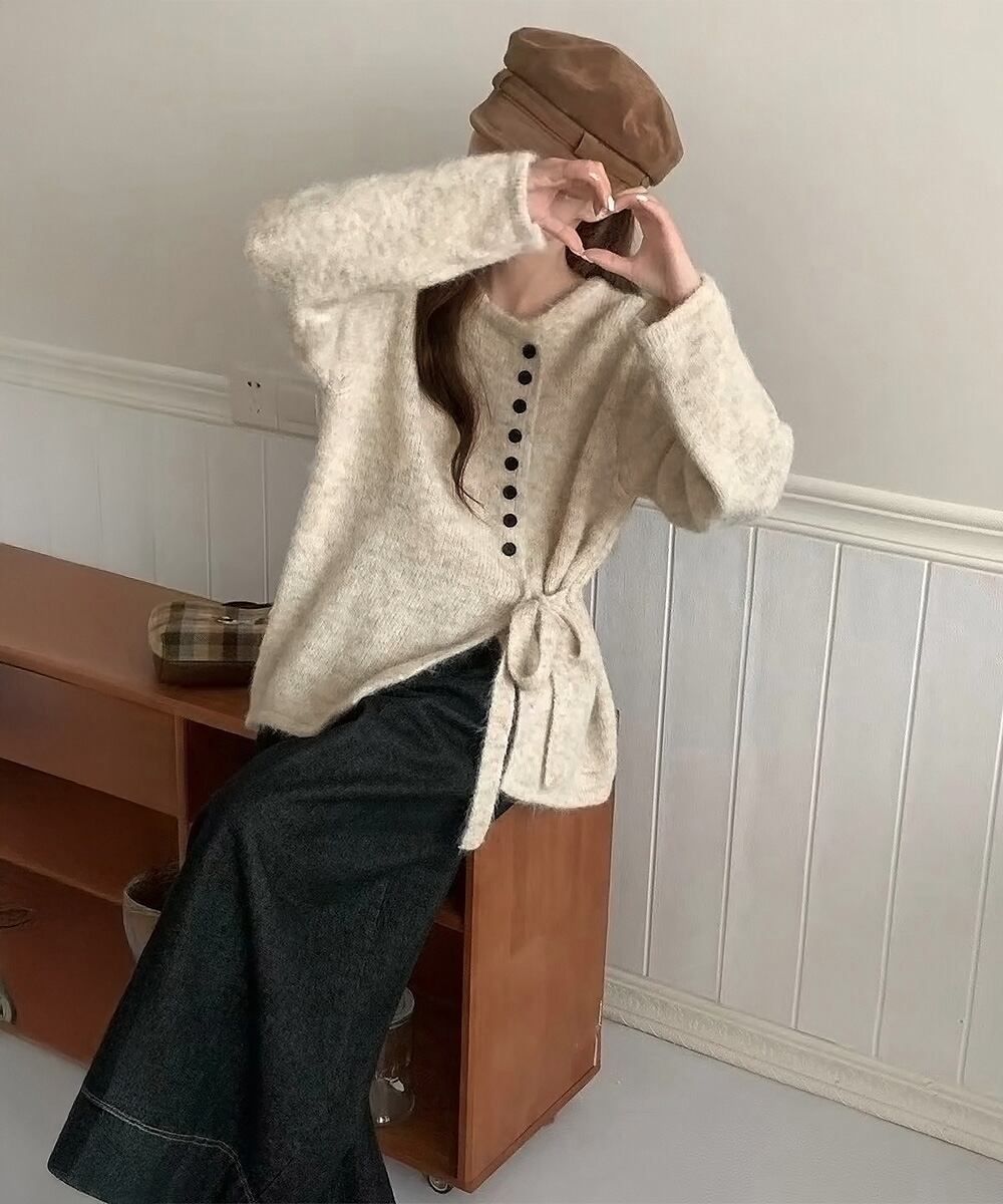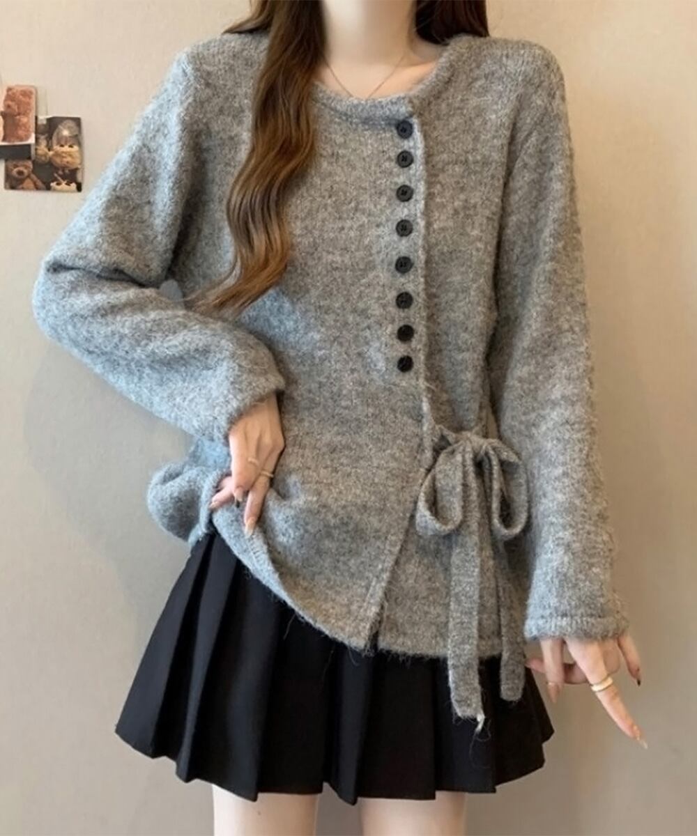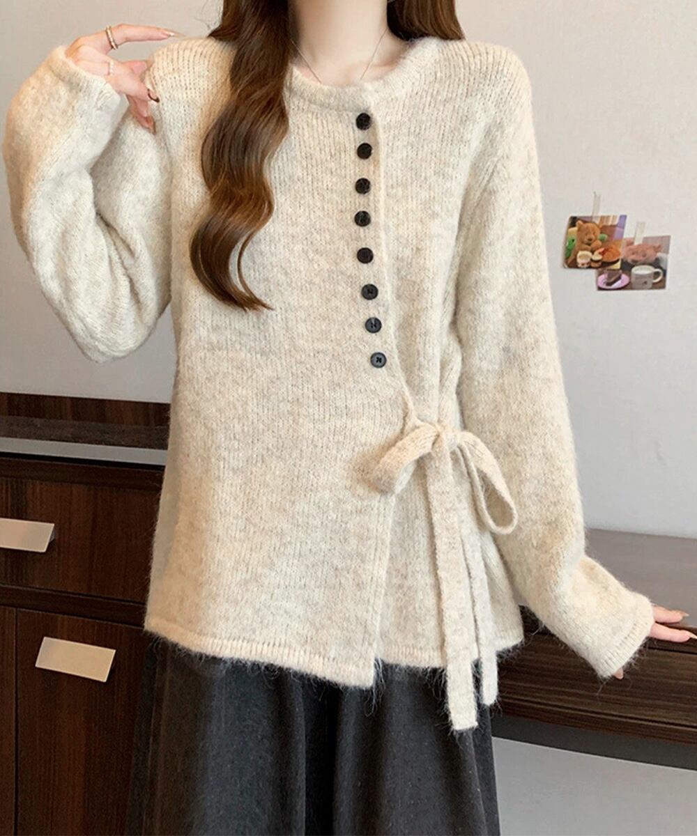 サイドリボンニットトップスボタンデザイン 長袖ニットセーター 韓国風 大人可愛いニットカーディガン ベーシック 大人カジュアル 着やせ秋冬服 おしゃれ ニット トップス セーター VEZY ベジー ItemNo.【23328768 】