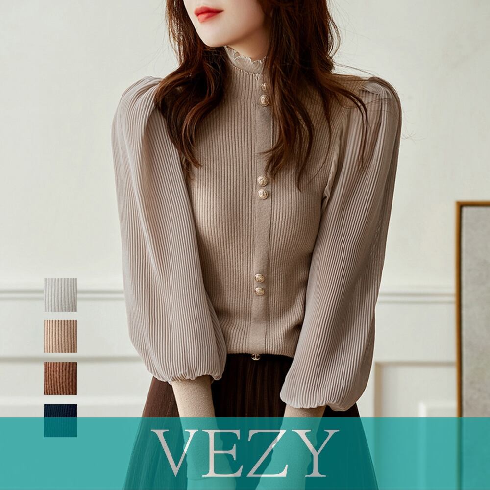 バルーン袖 リブニットトップス 韓国風 袖切り替え シフォンプリーツ ブラウス パフスリーブ ドッキングニット プチハイネック トップス 春秋冬 ニット トップス セーター VEZY ベジー ItemNo.【16393442 】