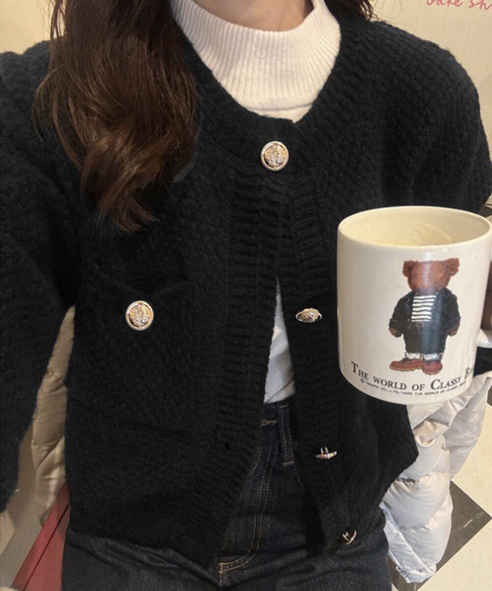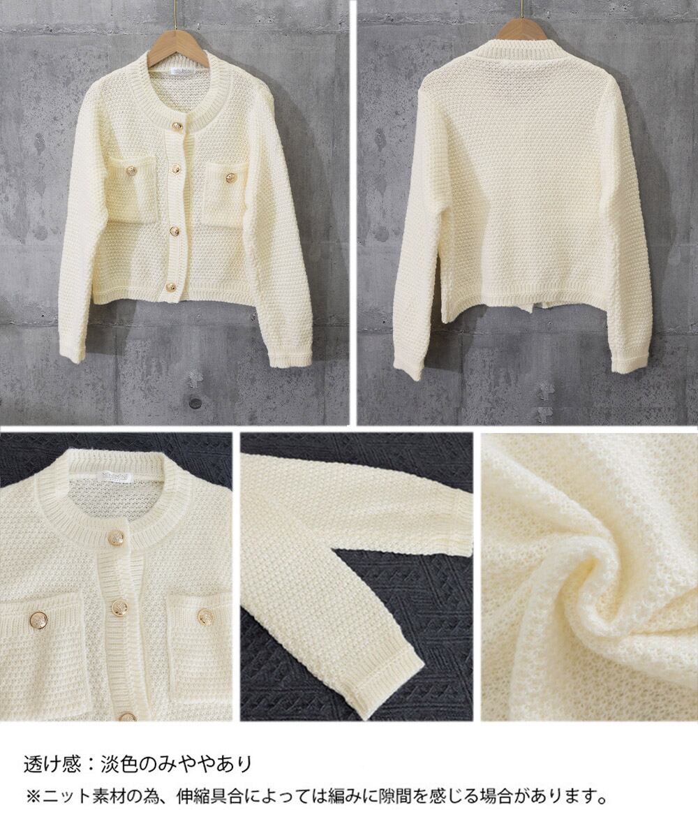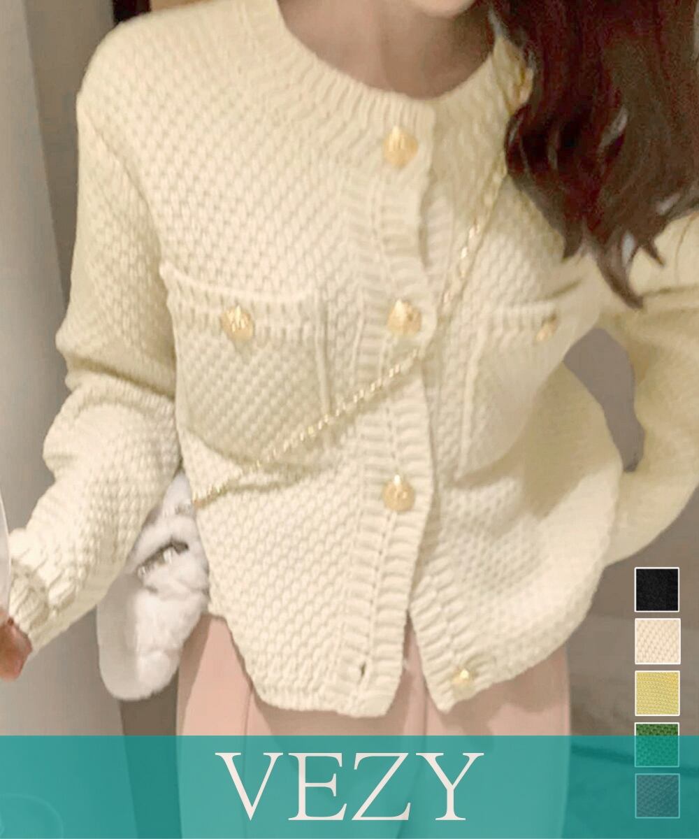 ゴールドボタンニットカーディガン 韓国風 ショート丈ニットカーディガン春秋 お洒落ニットトップス 大人可愛い長袖羽織り クルーネックきれいめカジュアル ニット トップス セーター VEZY ベジー ItemNo.【23592674】