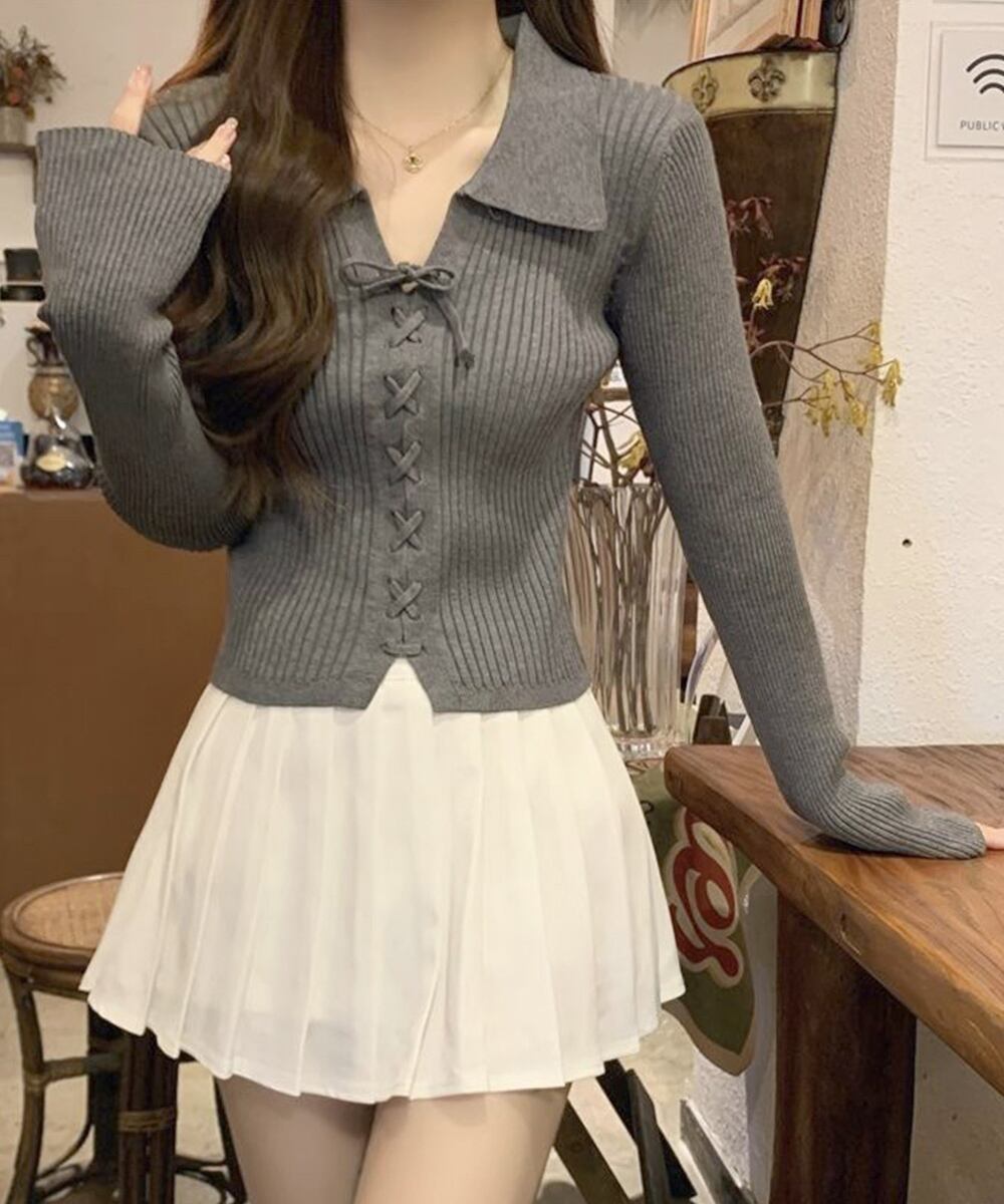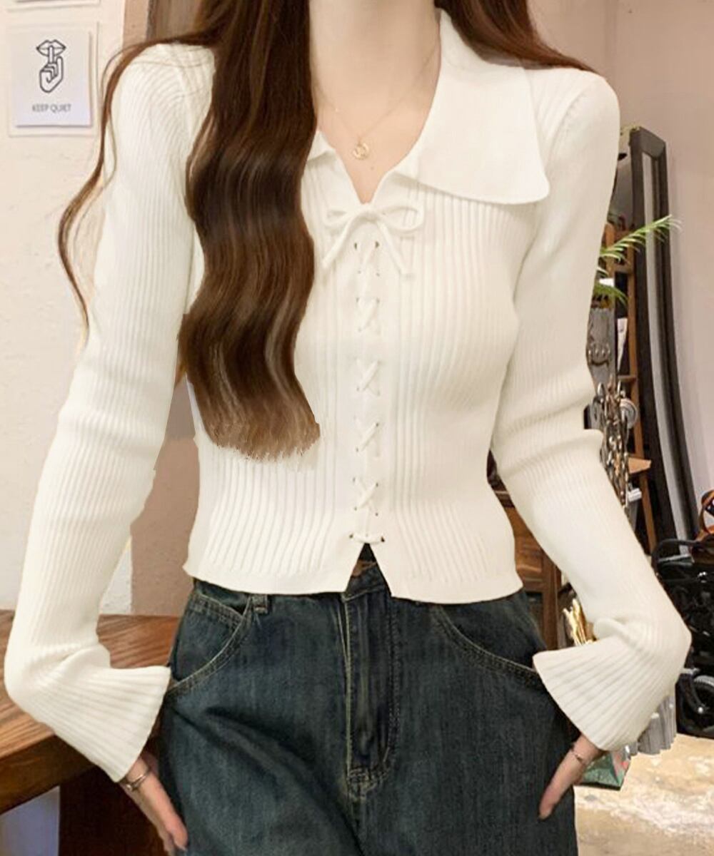 リボン編み上げが目を惹く、フェミニンムードのリブニットトップス。