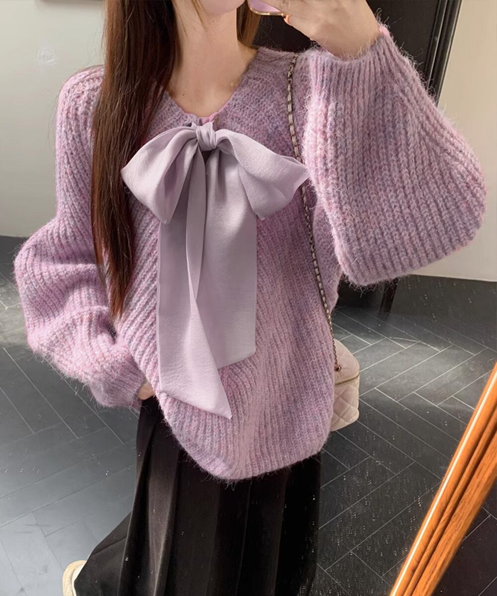 フェミニンニット春 リボン付きセーター 上品甘めニット秋冬
