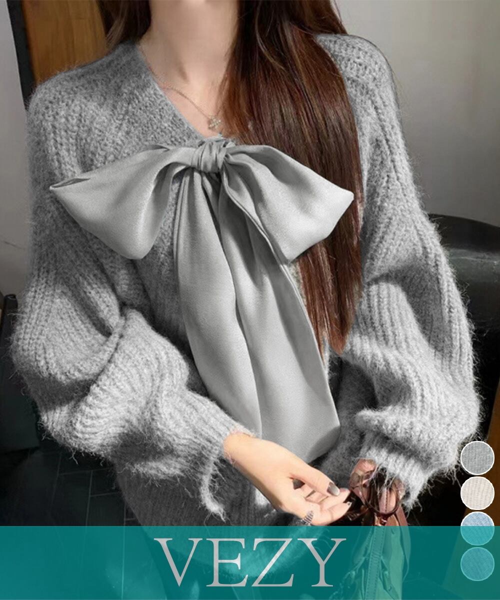 ビッグリボンタイニットプルオーバー韓国風 大人可愛い Vネックニットトップスきれいめ 前後2WAYリボン結びニット ゆったりローゲージニット おしゃれ柔らかニット ニット トップス セーター VEZY ベジー ItemNo.【23582739 】
