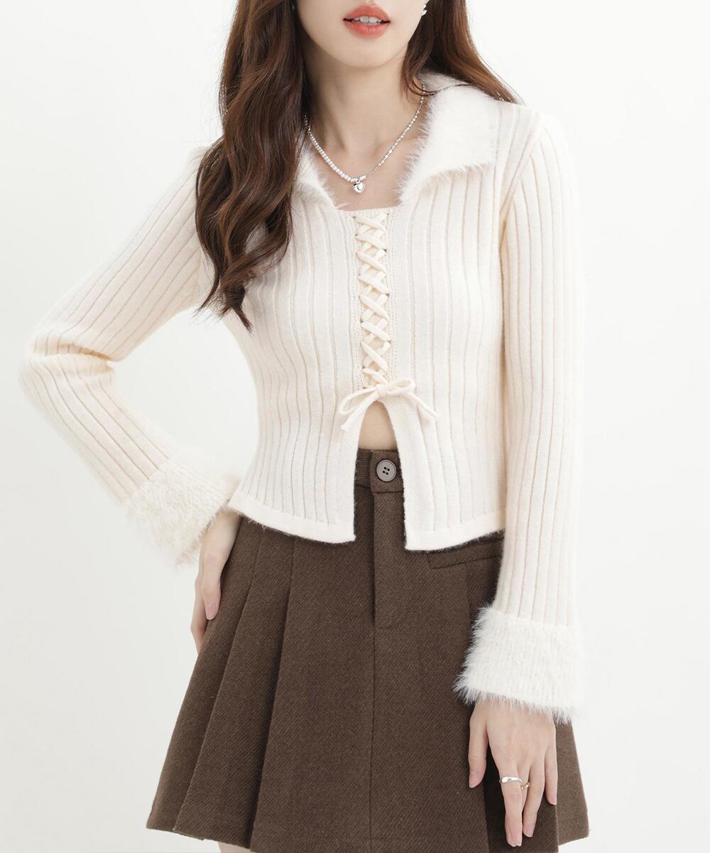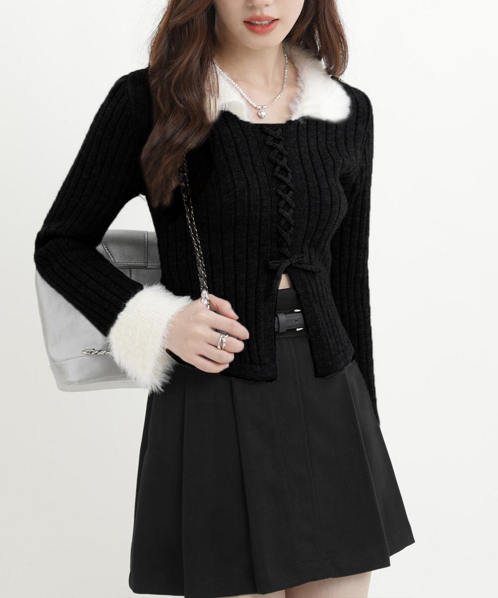 襟元と袖口にエコファーをあしらった、フロントレースアップのリブニットセーター。