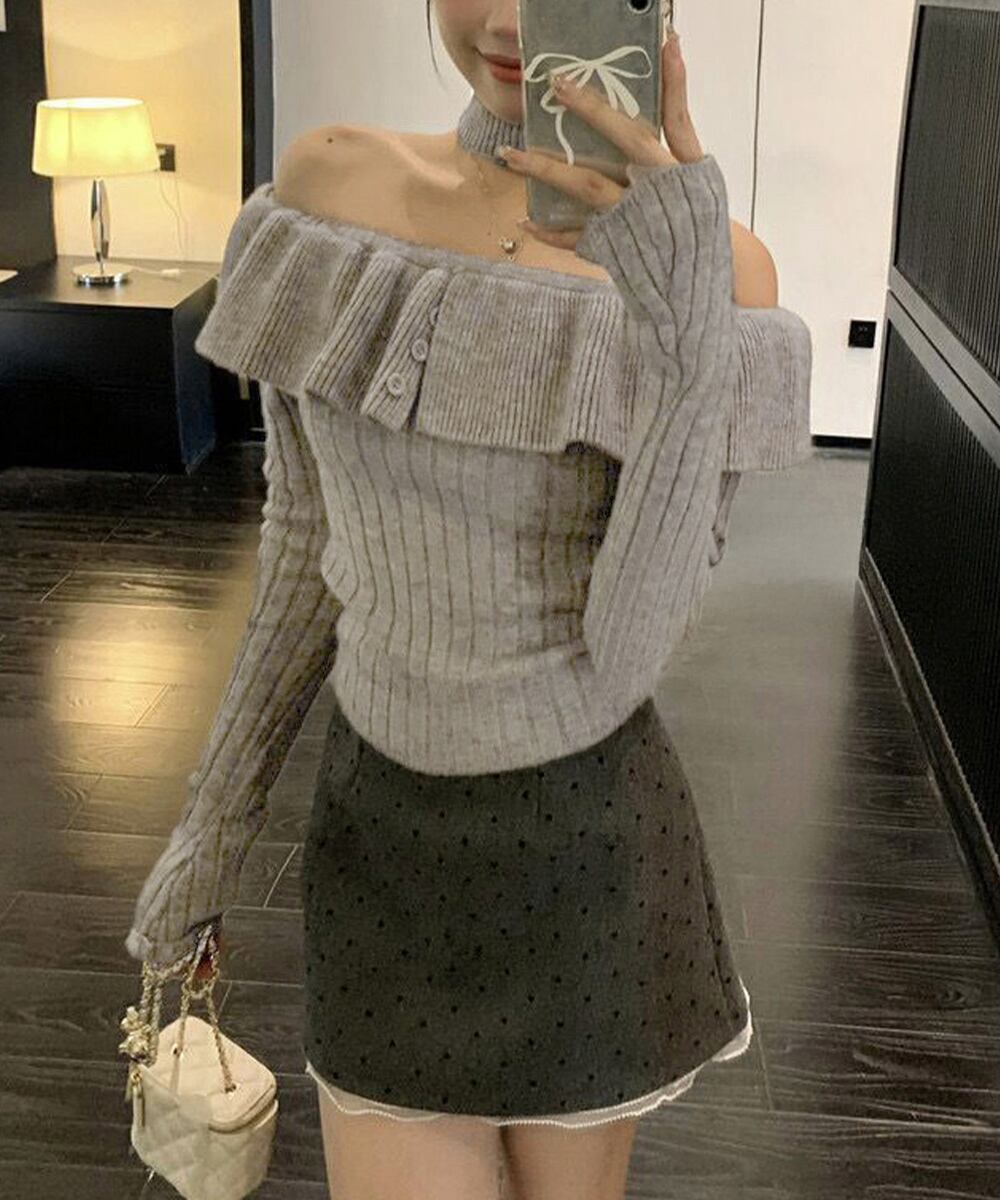 チョーカーネックニットトップスオフショル 大人可愛い セパレートネック リブニットカットソー オフショルダー フリルニット着やせ 2WAYトップス春秋 ニット トップス セーター VEZY ベジー ItemNo.【23571207 】