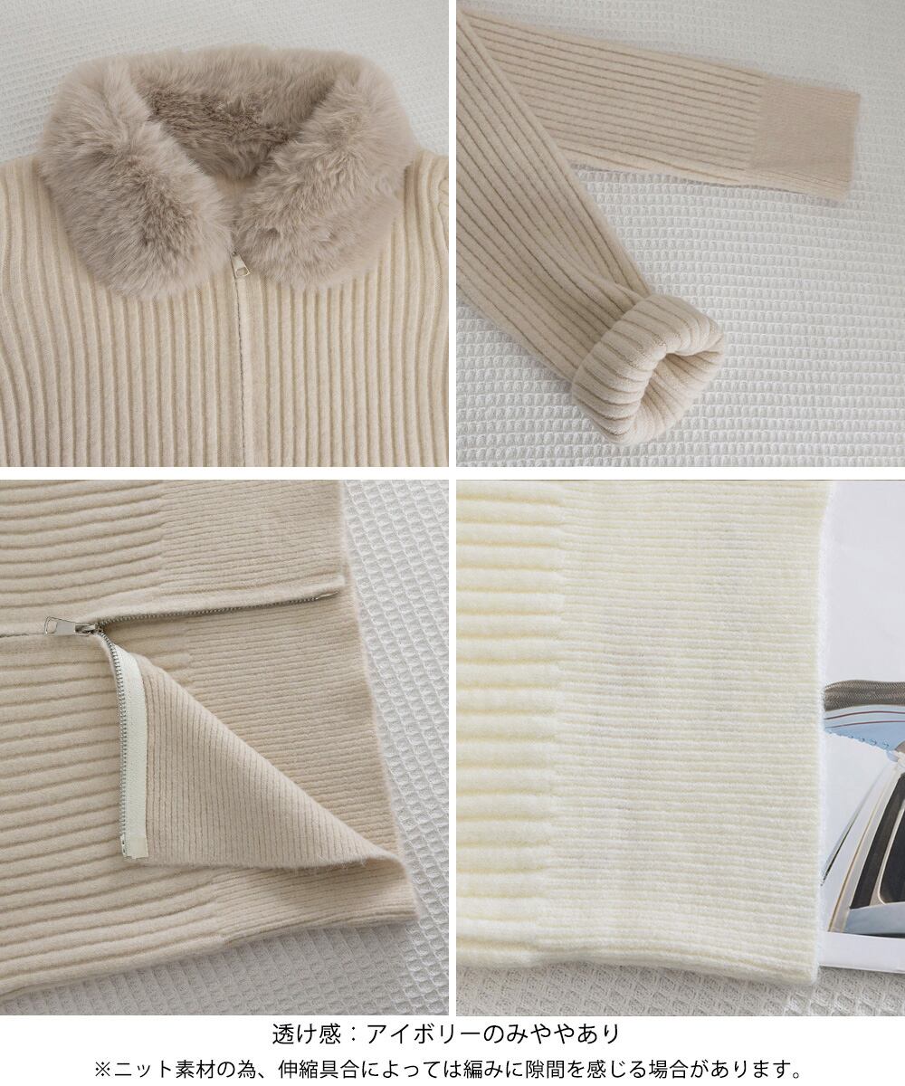 レディース おしゃれ エコファー襟リブニットトップス 首元あったかニットセーター カジュアル ジップアップニットアウター