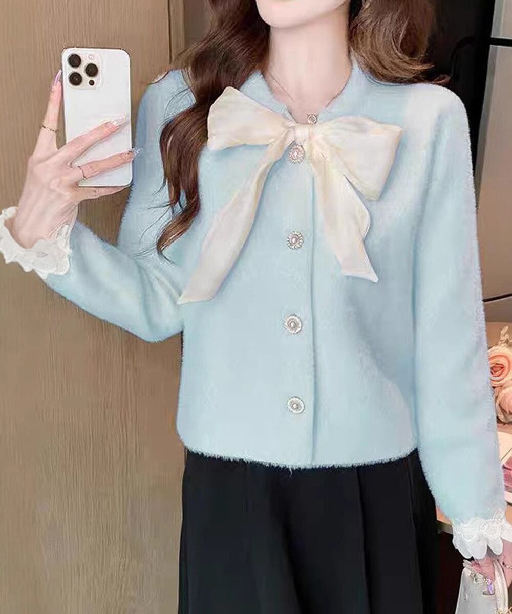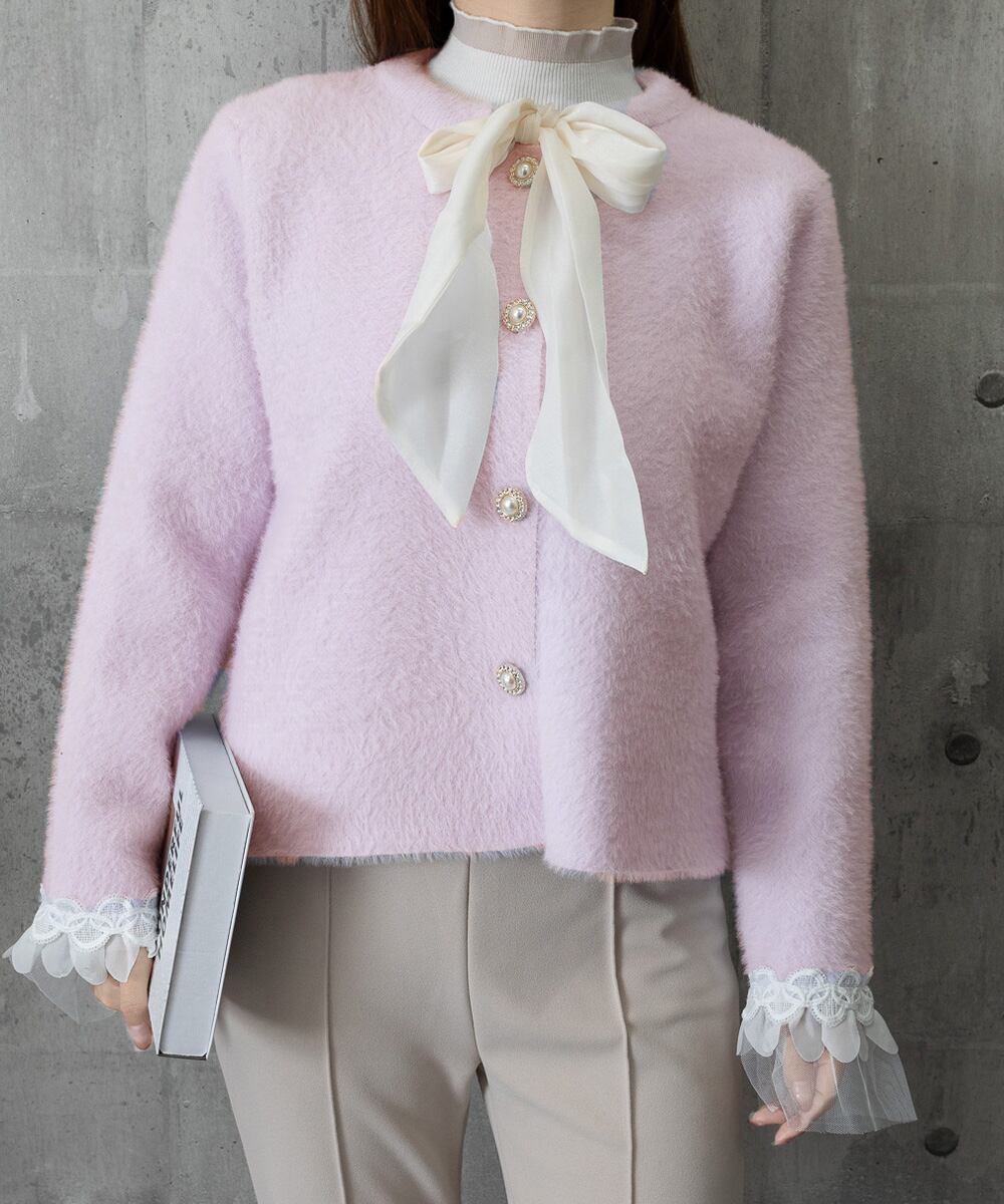 ボウダイ ニットトップス シャギーニット 大人可愛いニットセーター 袖レース オフィスカジュアル ビッグリボンニットカーディガン パール調ボタン韓国風 ニット トップス セーター VEZY ベジー ItemNo.【23550018 】