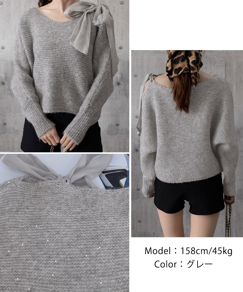 オフショルダーデザインにボウタイリボンをプラスした、大人可愛いニットトップス。