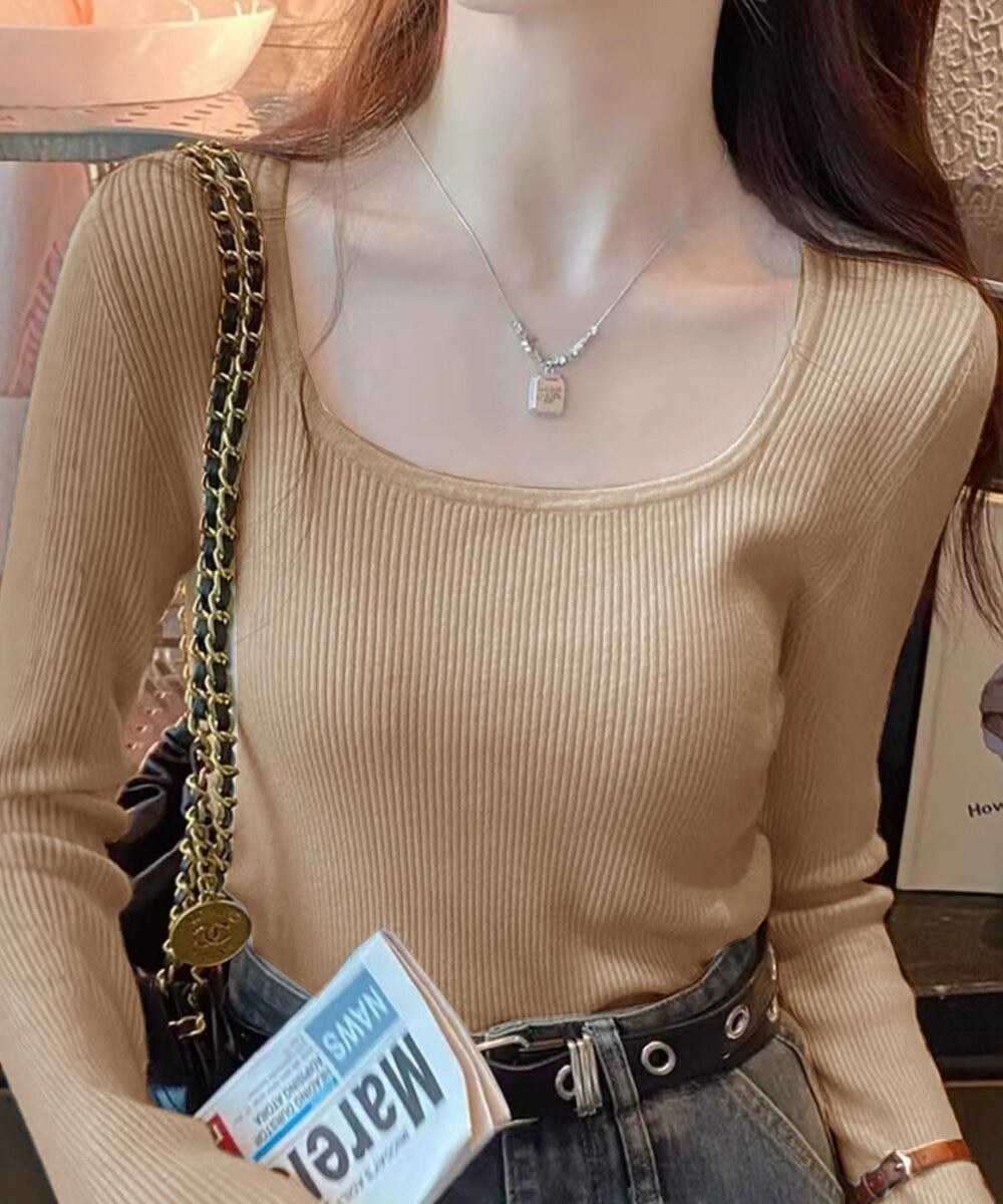 Uネックリブトップススクエアネックニット 長袖ニットプルオーバー タイトフィットニット秋冬 韓国風大人可愛い ニットインナー SNS映えトップス着回し ニット トップス セーター VEZY ベジー ItemNo.【23531407 】