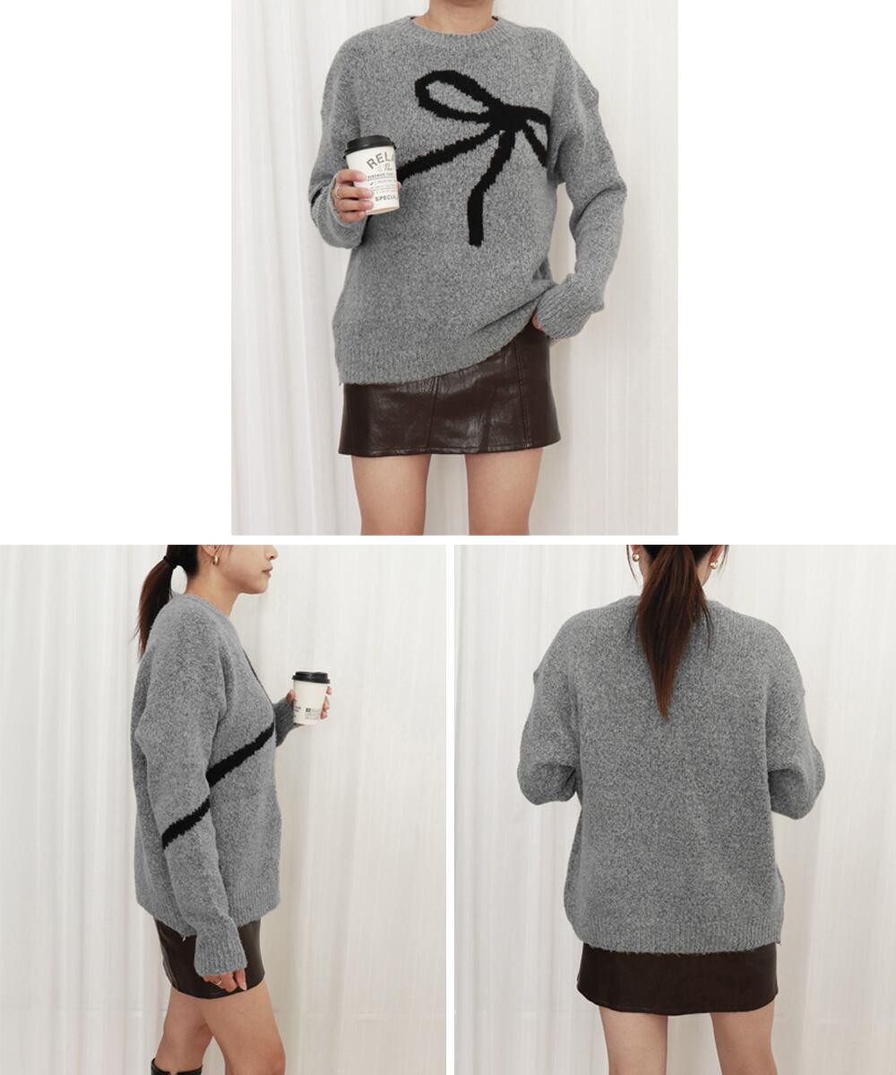 大きなリボン柄が目を惹くニットトップス。