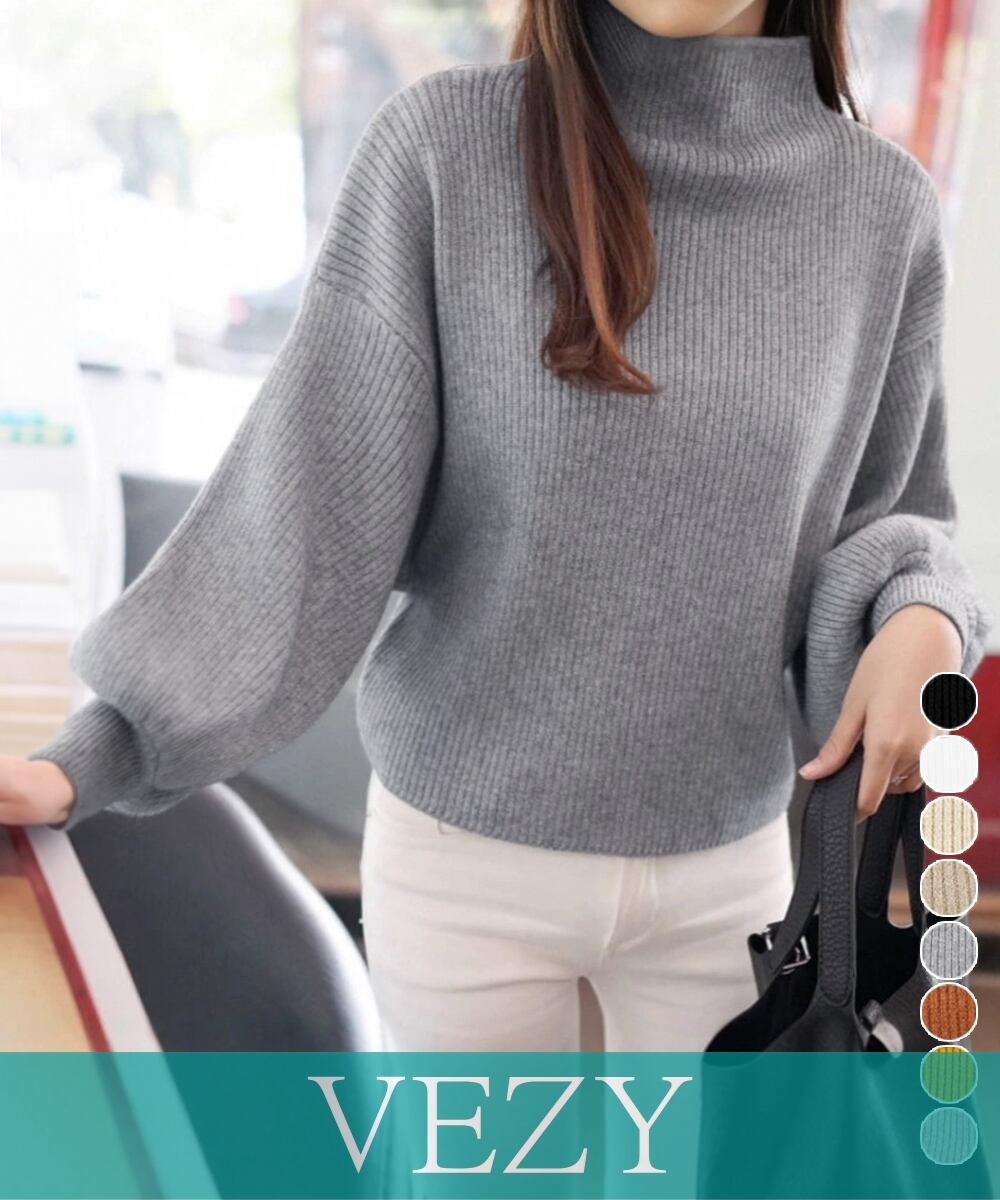 韓国風リブニットトップスハイネックニット 長袖ニットセーターランタンスリーブ 柔らかいニットソー暖かい チクチクしないニットプルオーバー 無地インナートップス秋冬 ニット トップス セーター VEZY ベジー ItemNo.【23430430 】