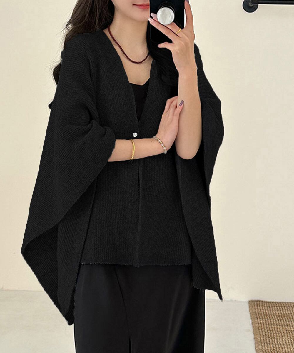 ストールのように羽織れる無地ポンチョ風ニットカーディガン。