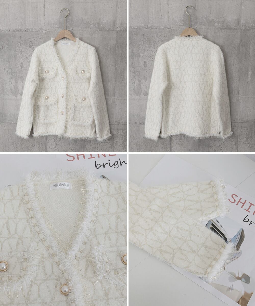ラメ糸ニットカーディガン ミンク風ライトアウターきれいめパールボタン 秋冬ニットブルゾン大人可愛い ノーカラージャケット