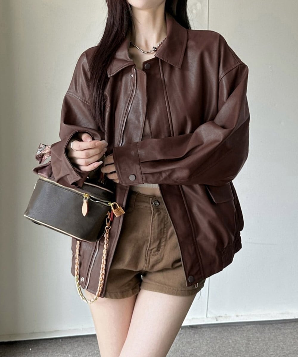 トレンド感たっぷりのレディースドロップショルダージップアップPUレザージャケット。