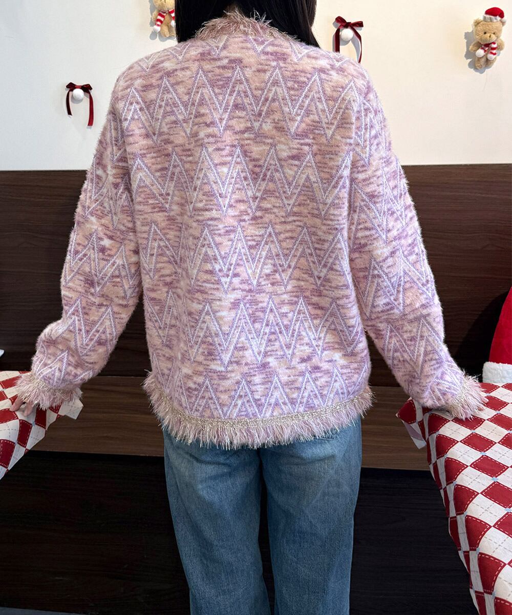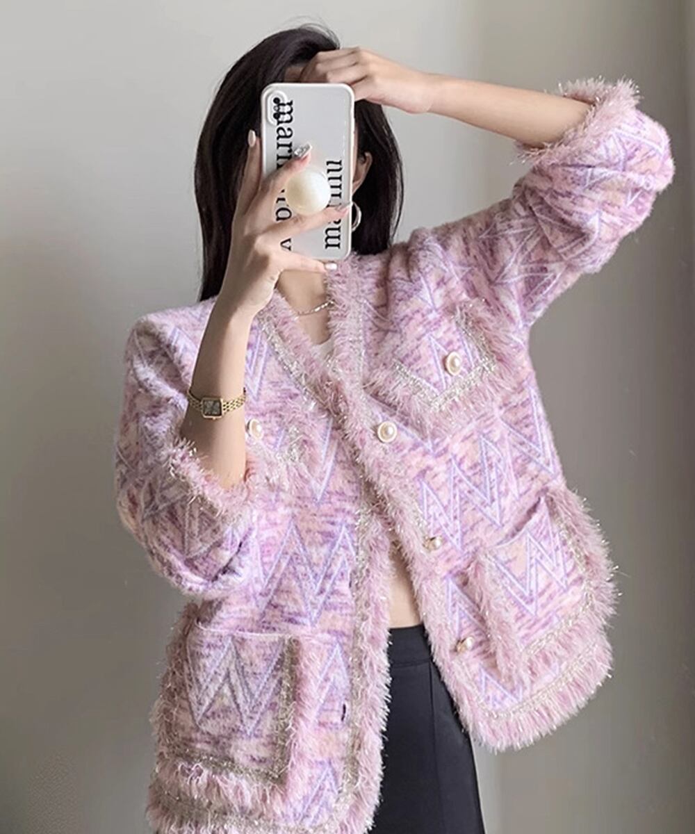 ラメツイード風ジャケット韓国風おしゃれ ノーカラージャケット セミフォーマル羽織り ふわふわ ニットカーディガン 上品エレガント 暖かいアウター春秋冬 アウター コート ジャケット VEZY ベジー ItemNo.【21967425 】