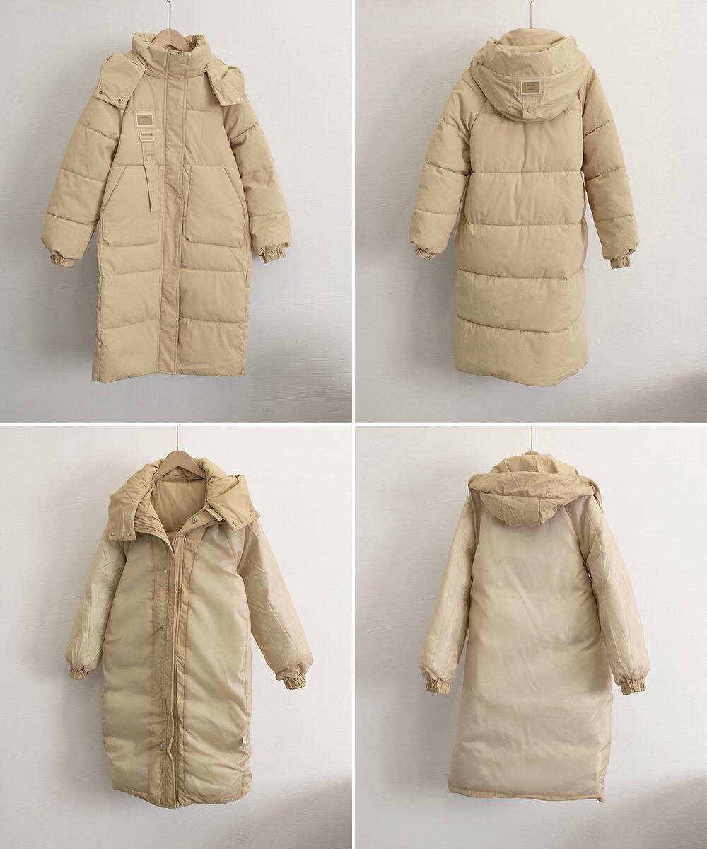 すっぽりハイネックとフード付きで暖かく、ゆったりめのエコダウンロングコート