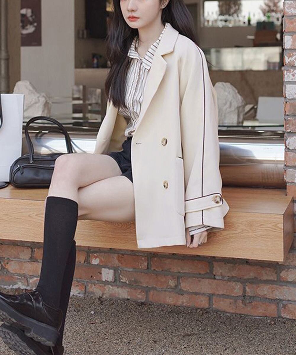 ダブルブレストジャケット ミディアム丈春コート ポケット付きスーツジャケット 春秋ライトアウター パイピング 軽アウター