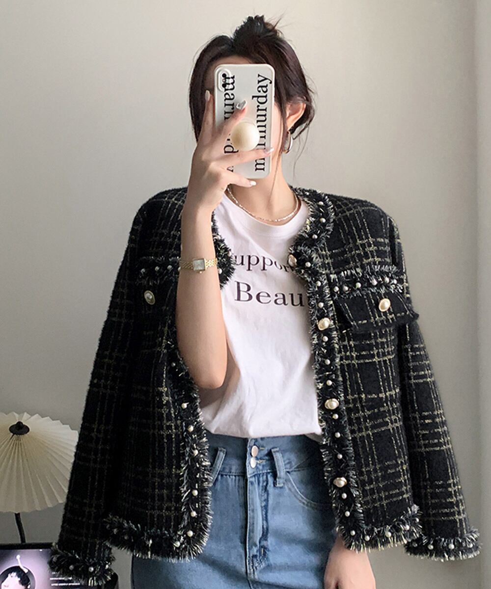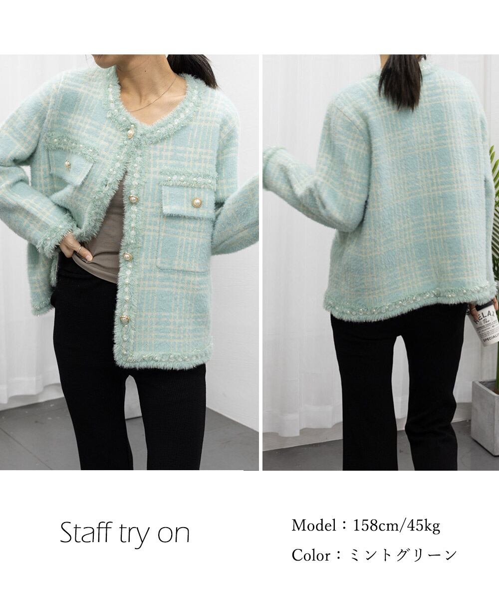 ラメ糸を織り込んでいるので上品な輝きを放ち、縁にあしらったフリンジとフェイクパールボタンは清楚女子のフェミニンテイストをPLUS