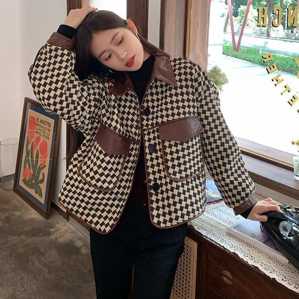 レトロな格子とPUレザーの切替デザイン、異素材mixが新鮮な韓国風ショート丈ジャケット