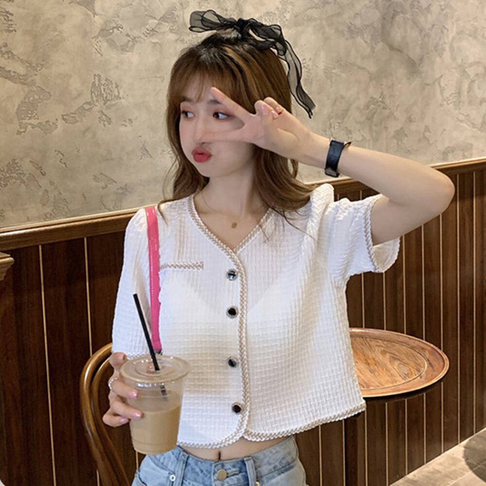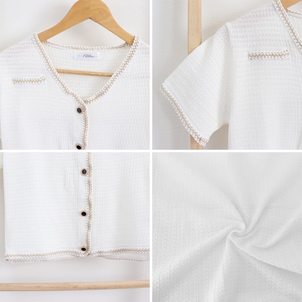 ツイード風半袖ジャケットレディース韓国風 サマーカーディガン Vネック 透かし編みニット ショートカーデ 立体感 シャツ ラメ入り羽織り 夏 トップス バイカラー アウター コート ジャケット VEZY ベジー ItemNo.【17513772 】