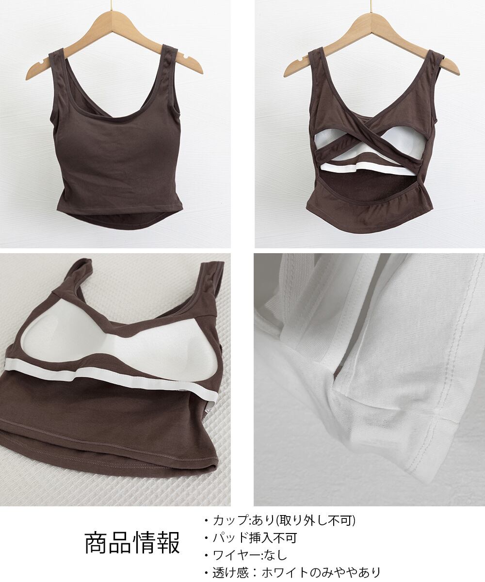 カップ付きで、一枚でも安心して着られるクロスバックタンクトップ。