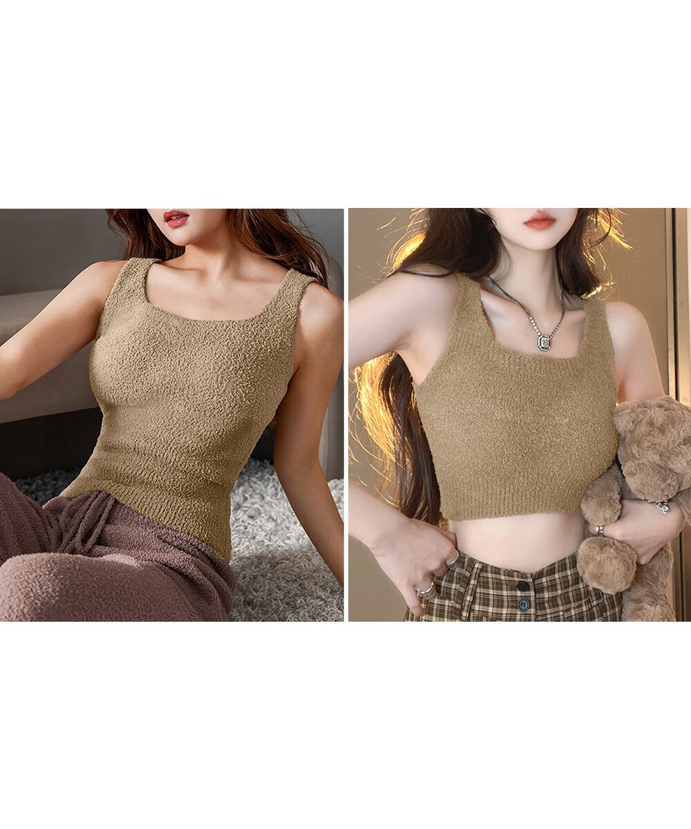 もこもこボア生地が暖かくて滑らか、カップ付きなので1枚でも気軽に着用できるニットタンクトップ