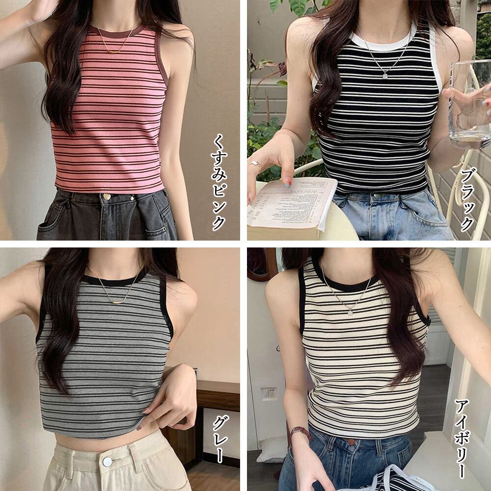 クロップド丈 タンクトップ ボーダー柄 レトロ ノースリーブトップス パイピングカットソー アメカジ クルーネック ニットtシャツ おしゃれ 春秋夏タンクトップ インナーVEZY ベジー ItemNo.【19337542】