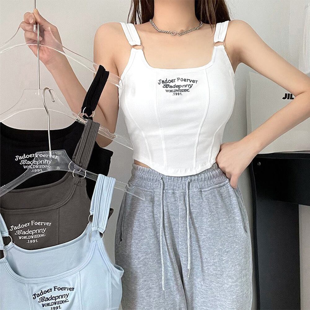 カップ付き タンクトップ ショート丈韓国 可愛い クロップド丈トップス へそ出し セクシーキャミソール ロゴ ダンス衣装 おしゃれ夏服ブラ付きインナータンクトップ インナーVEZY ベジー ItemNo.【19220789】