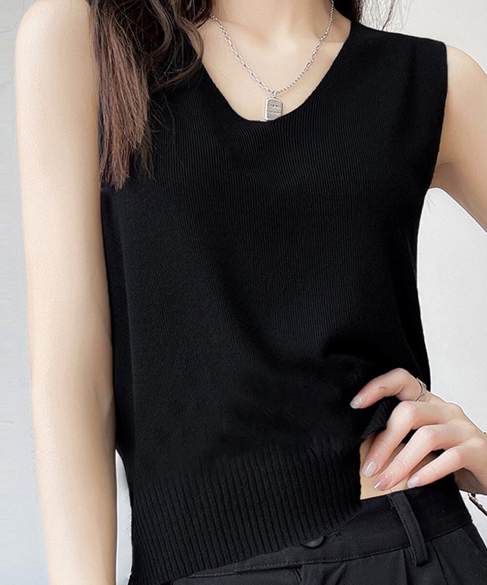 Vネックデザインで首回りを綺麗に魅せられるニットタンクトップ