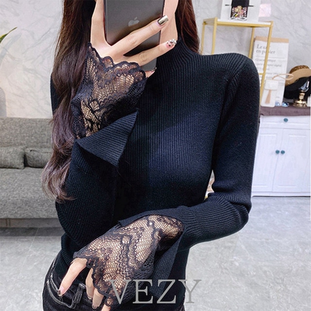 リブ編みでシャープな体のラインを演出、袖先はレース付きで可愛い印象