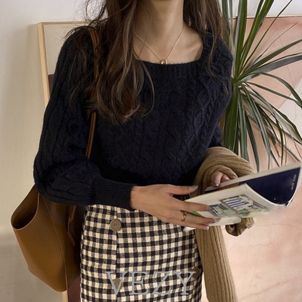 ケーブルニット スクエアネック 韓国風 ショート丈 ニットトップス ボリューム袖 おしゃれ ニットセーター カジュアル レディース ニット セーター lstpベジー VEZY ItemNo.【16615379 】