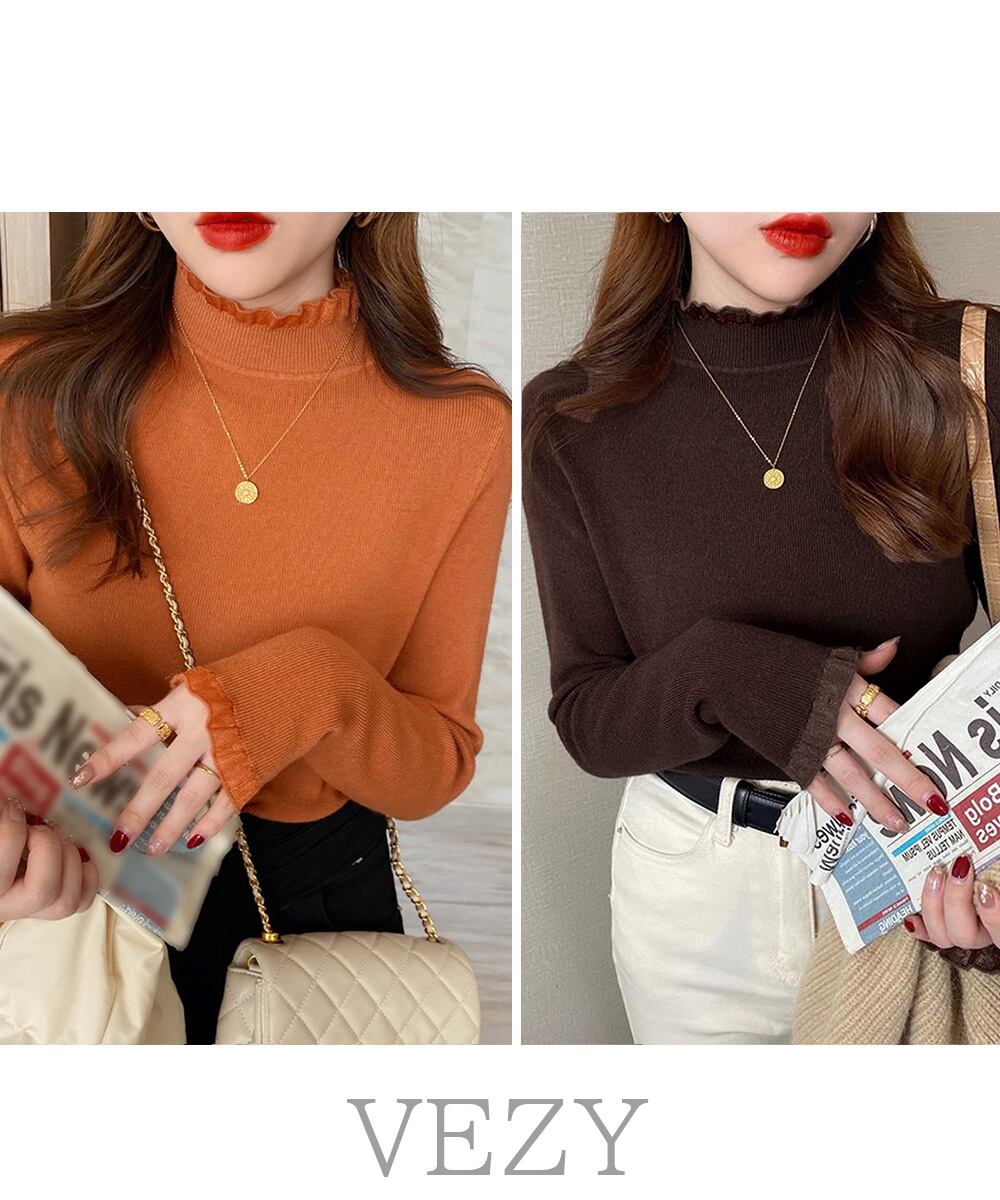 ハイネックニットトップスフリルニットソー メロウフリルニット きれいめ ベーシック ニットインナー着回しニット 重ね着レイヤード フェミニンニットプルオーバー7色 レディース ニット セーター lstpベジー VEZY ItemNo.【20304237 】