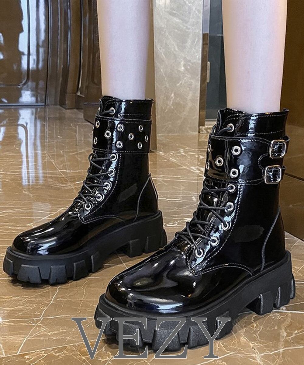 厚底ショートブーツ 黒ストームブーツ美脚 かっこいい エンジニアブーツ裏起毛 バックファスナー ワークブーツ 歩きやすいミリタリーブーツ レースアップ 靴 shoes シューズ ベジー VEZY ItemNo.【20215707 】