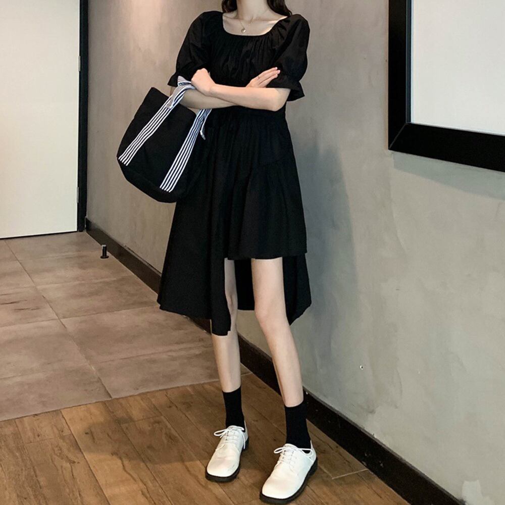 パフスリーブ アシンメトリーワンピース レディース オフショルダーワンピ 体型カバー フレアワンピ スクエアネック