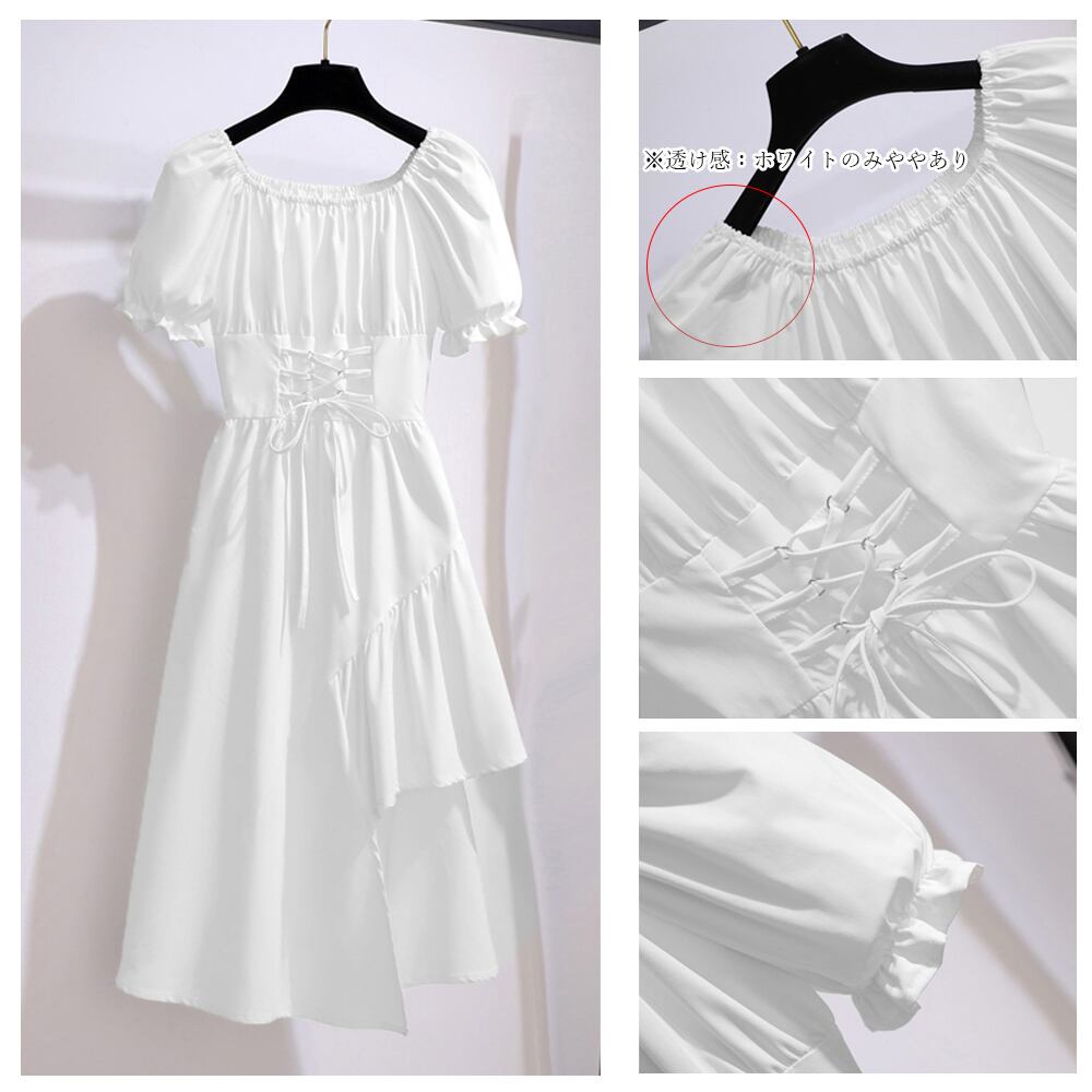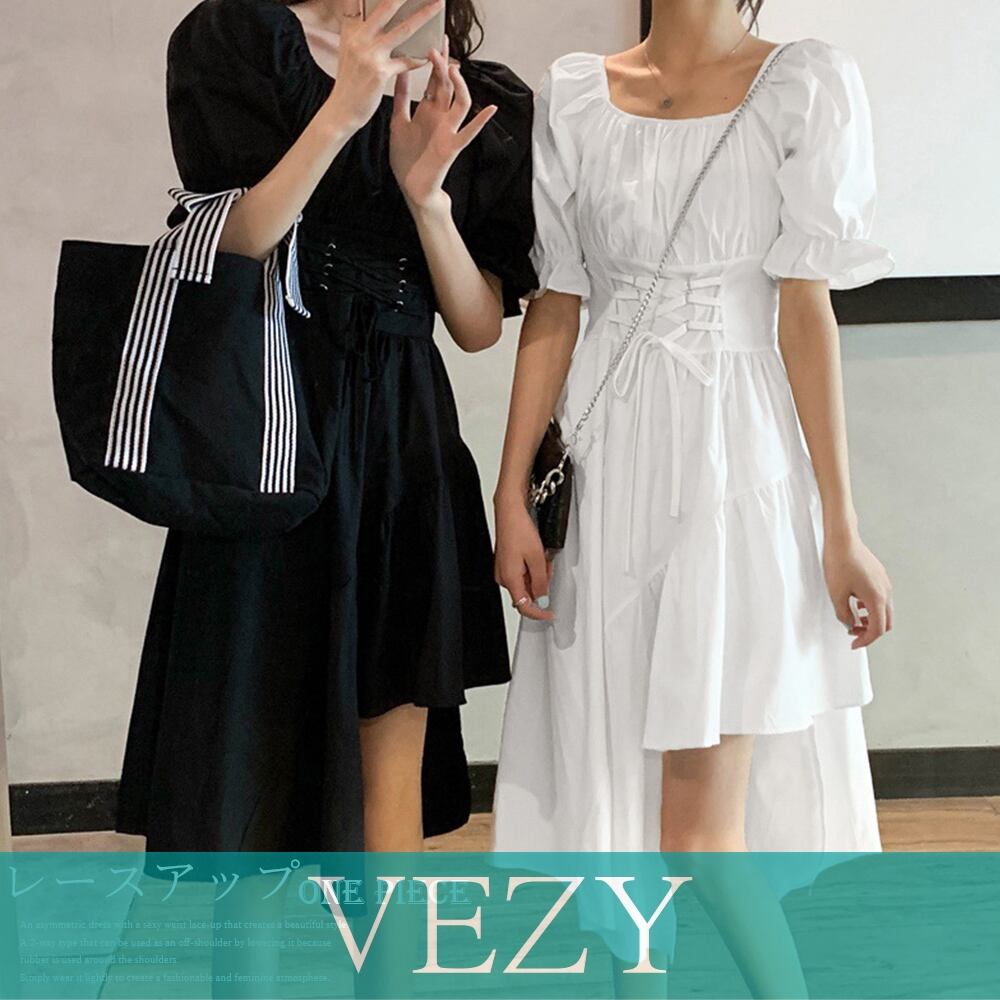 ウエストレースアップ ワンピース 韓国風 パフスリーブ アシンメトリーワンピース オフショルダーワンピ 体型カバー フレアワンピ スクエアネック ワンピース チュニック ベジー VEZY ItemNo.【17248184 】