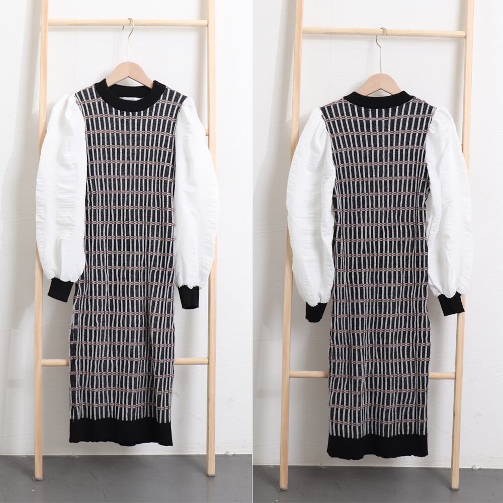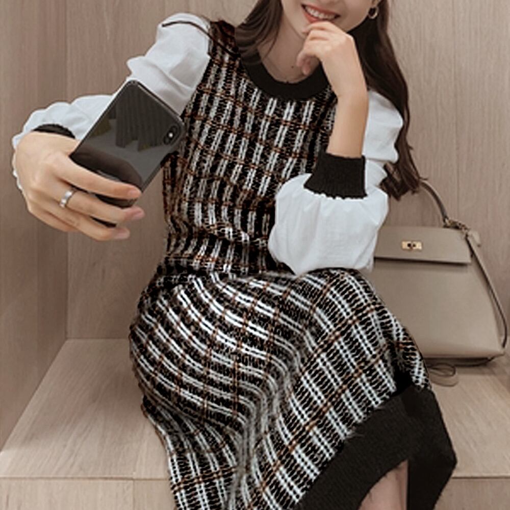 ニットワンピース 袖異素材 パフスリーブ ドッキングワンピース 長袖 レイヤード風 チェック柄ワンピ オシャレ ロングワンピース 秋冬 韓国 大人 ワンピース チュニック ベジー VEZY ItemNo.【16089126 】