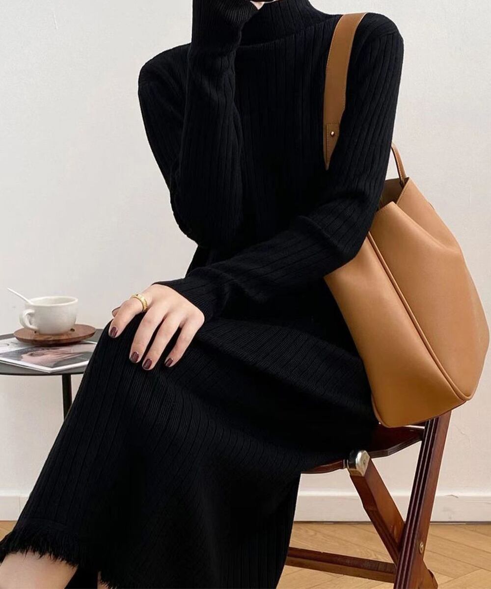 裾フリンジ付き リブニットワンピース秋冬 プチハイネック ロングワンピース 体型カバー 大人カジュアル 長袖 ミモレ丈インナーワンピ 着やせ おしゃれ ワンピース チュニック ベジー VEZY ItemNo.【20304225 】