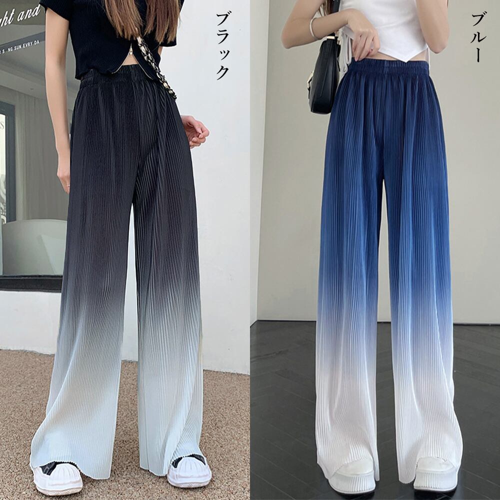 ワイドパンツ グラデーションパンツ 韓国 ハイウエスト ボトムス 冷感タッチ プリーツパンツ ストレートフルレングス 涼し気 体型カバーイージーパンツ ボトムス パンツ スカート ベジー VEZY ItemNo.【19666709 】