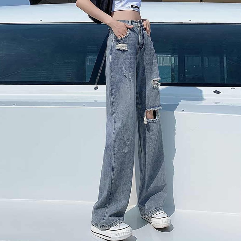 ダメージ デニムパンツ ハイウエスト韓国 ゆったり セミワイドパンツ 体型カバー ジーンズ おしゃれ 美脚ジーパン カジュアルロングパンツ ストレート ボトムス パンツ スカート ベジー VEZY ItemNo.【19611238 】