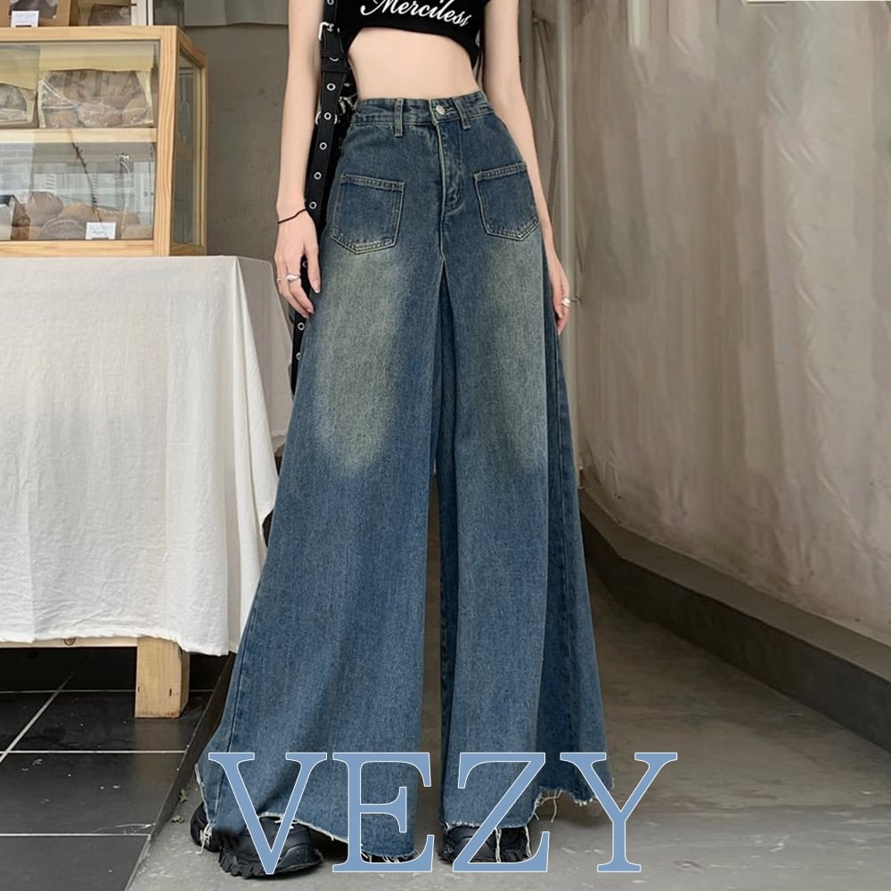 ワイドデニム レディースフレアパンツ韓国 ウォッシュ加工ジーンズ カットオフバギーパンツ ハイウエストスカンツ レトロジーンズ 美脚脚長 ヘムフレアデニムお洒落 ボトムス パンツ スカート ベジー VEZY ItemNo.【19827339 】