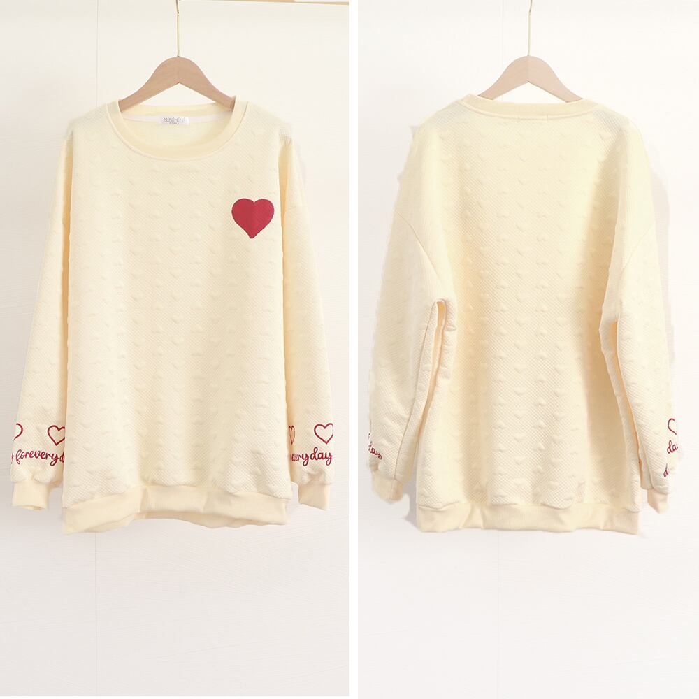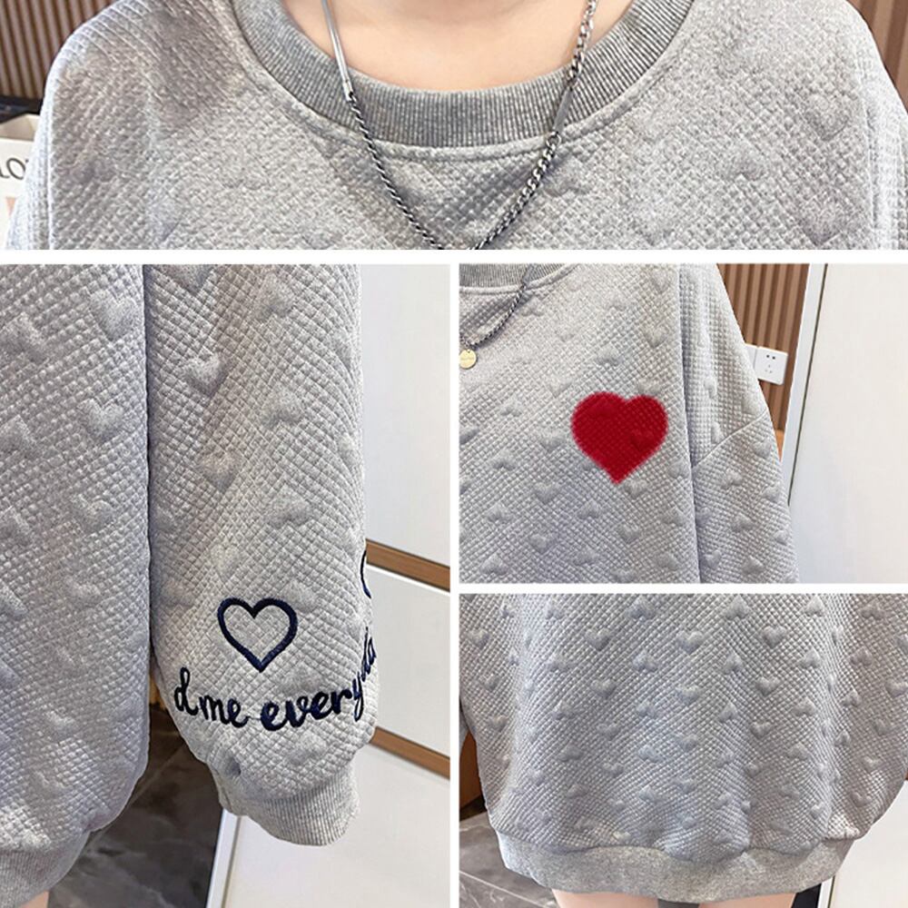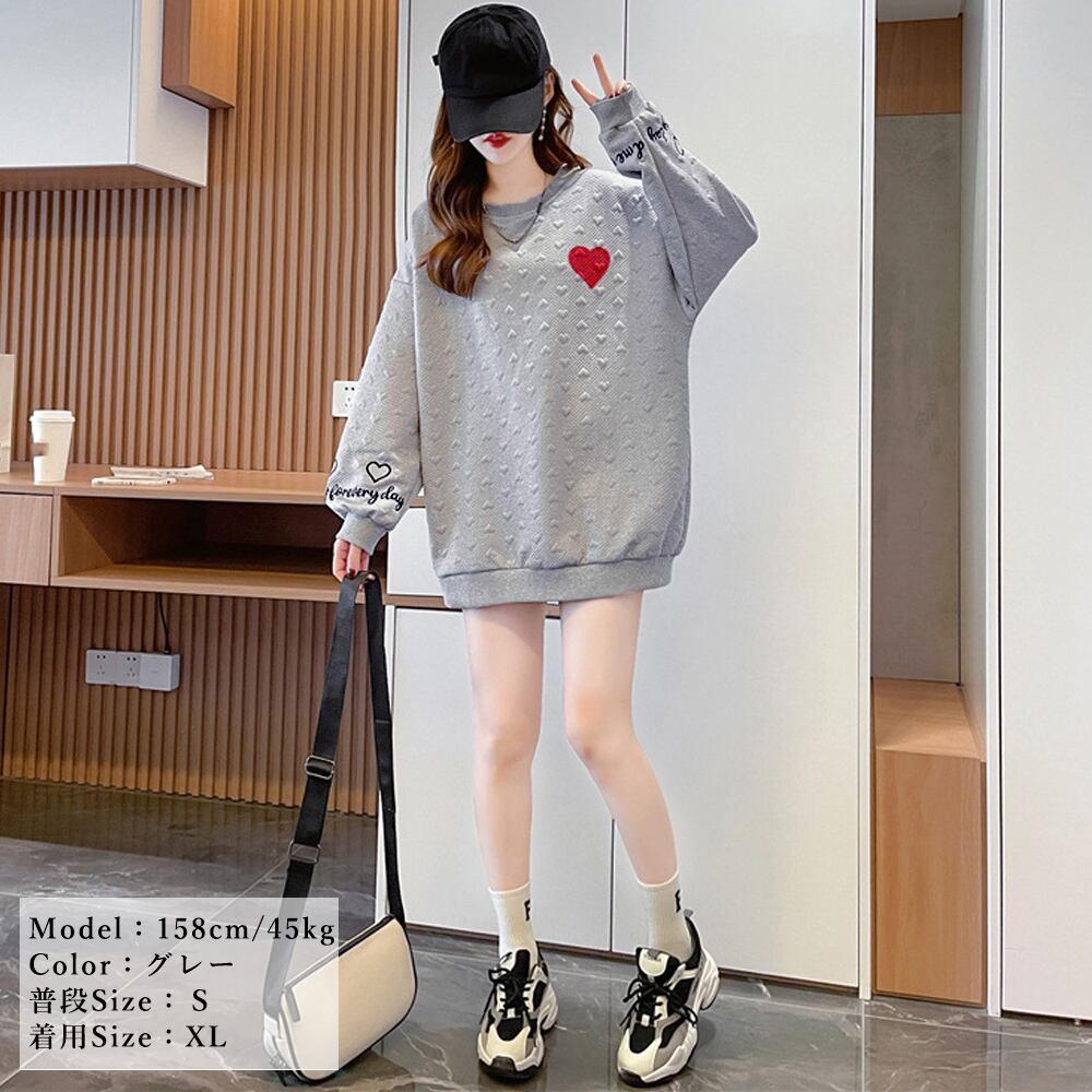 カジュアル ラウンドネック ロゴトレーナー エンボス加工 長袖プルオーバー ハート刺しゅう 体型カバー ロンT 春秋服
