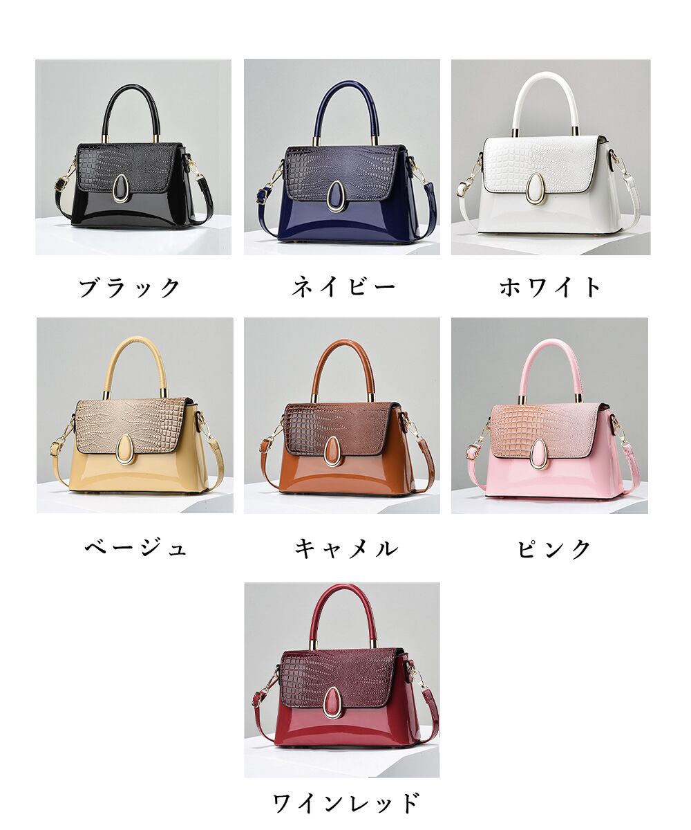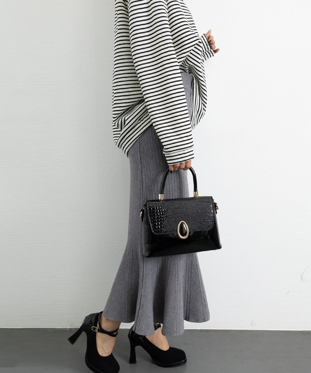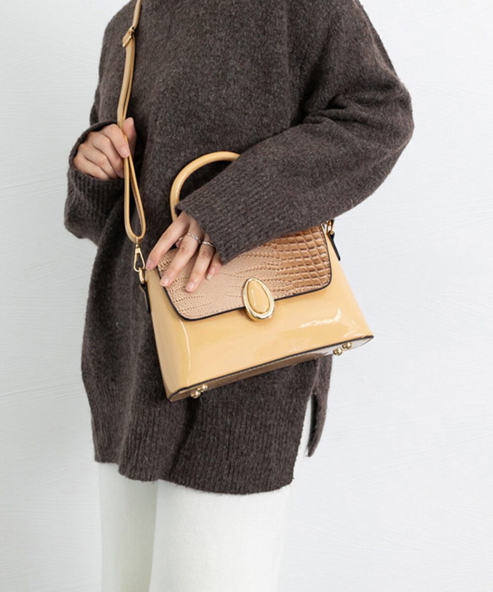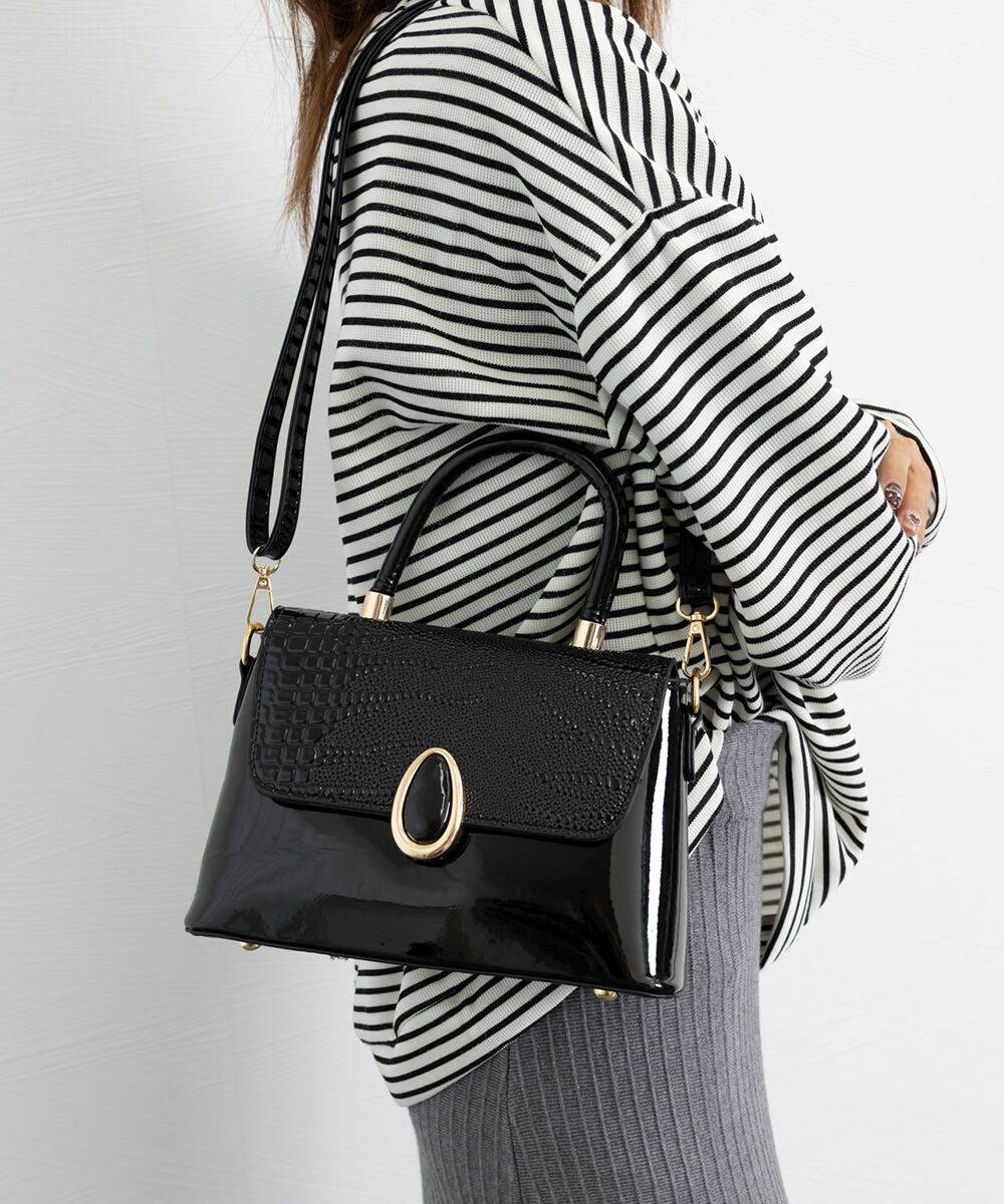クロコ型押しフラップとエナメルの合皮を組み合わせたフォーマルハンドバッグ