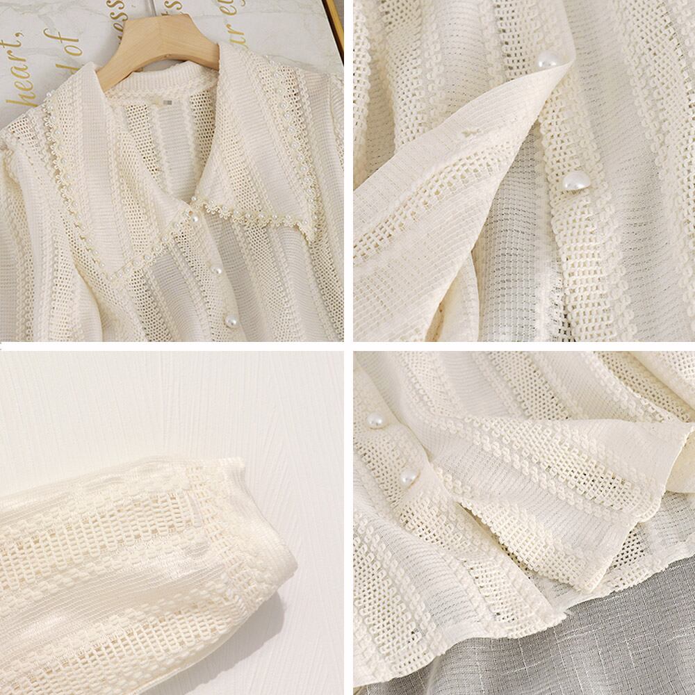 大きな襟とあしらったフェイクパールがポイントになったブラウス