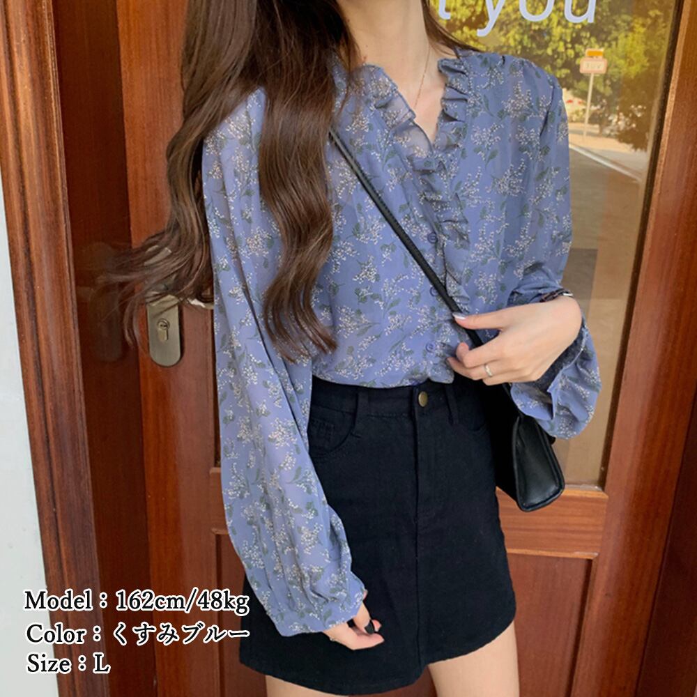 襟フリル シースルー 花柄ブラウス 女性 大人 ゆるシャツ パフスリーブ Vネック OL 通勤 トップス 20代 30代 40代 可愛い 長袖 フェミニン きれいめ キュート シャツ ブラウス ベジー VEZY ItemNo.【16089112 】