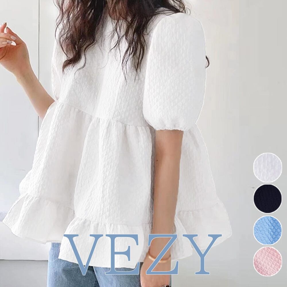 フレアトップスボリュームス袖 ブラウス夏 半袖トップス きれいめ カジュアル 体型カバー 切り替え ギャザー バックリボン カットソー 着やせ 夏服 シャツ ブラウス ベジー VEZY ItemNo.【19117016 】