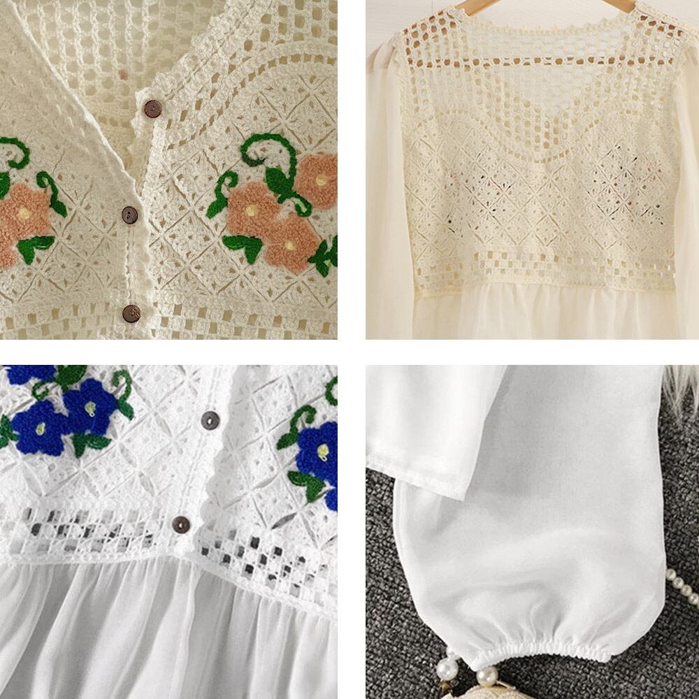 花刺しゅう シフォン袖 ニットトップス 透かし編み ニット コンビブラウス 長袖 シアー シースルー 透け感 韓国ファッション 花柄 シャツ ブラウス ベジー VEZY ItemNo.【19290863 】