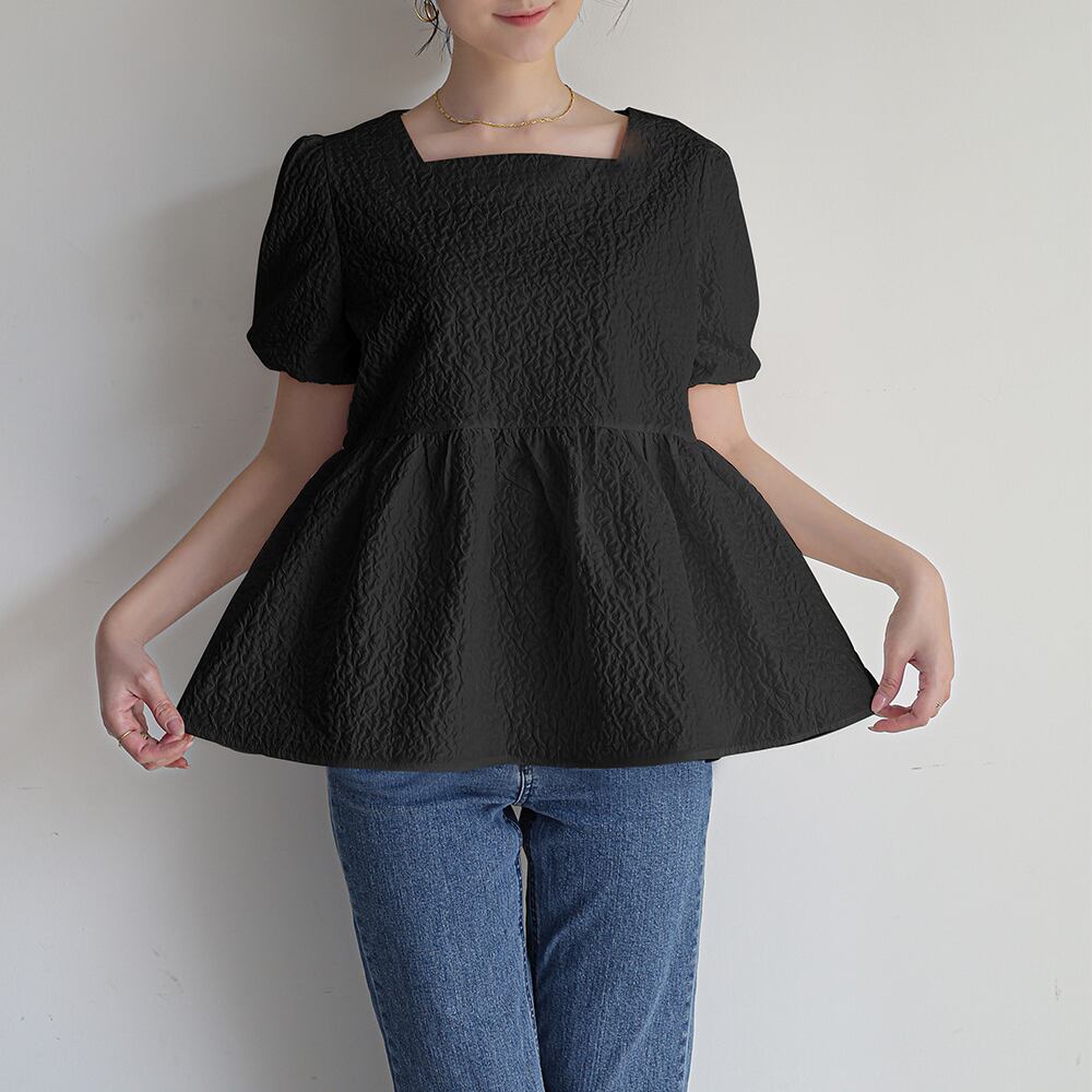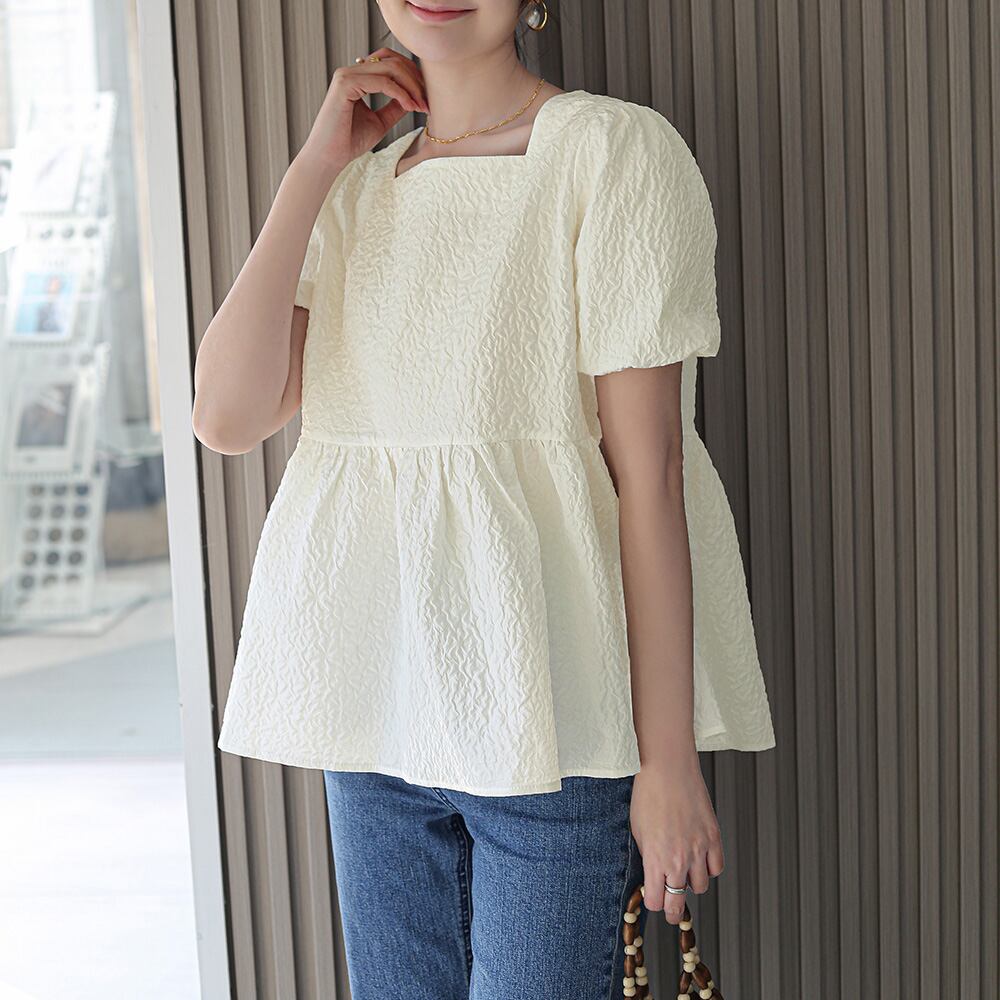 ペプラムブラウス スクエアネックトップス きれいめ 半袖フレアブラウス パフスリーブ ぽこぽこトップス春夏 無地バックリボン上品ブラウス 通勤おしゃれ シャツ ブラウス ベジー VEZY ItemNo.【19170642 】