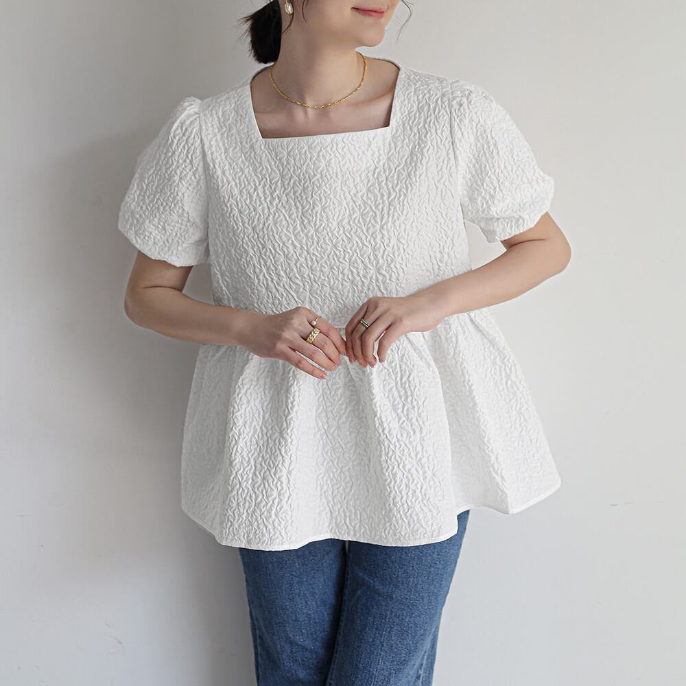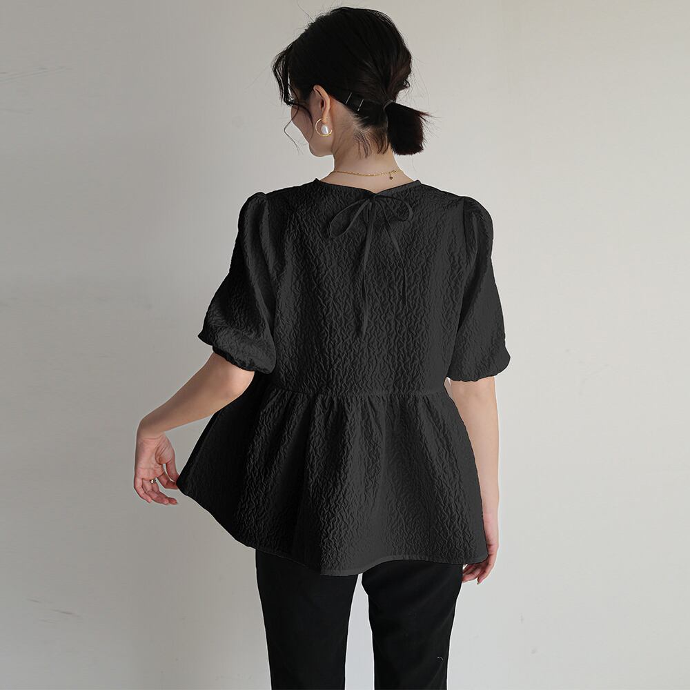 ぽこぽことした凹凸シワ加工を施した生地は独特の風合いがあり、程よいカジュアル感を演出してくれるペプラムブラウスです